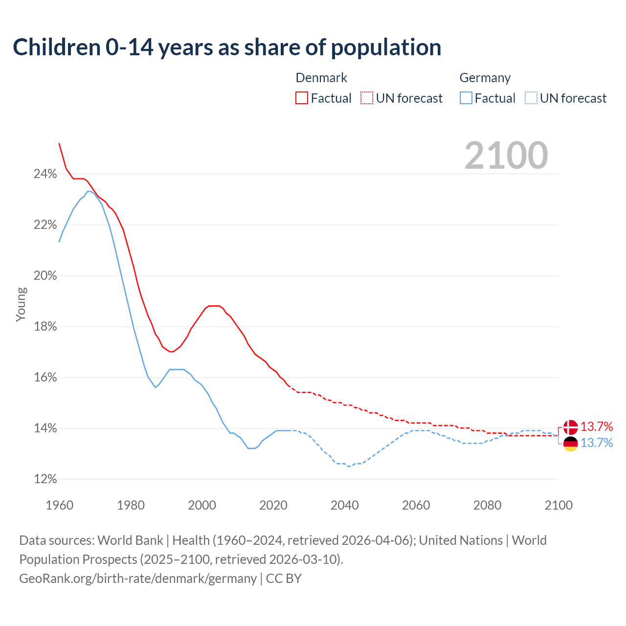 According to the latest available data on birth rates, the fertility rate in Denmark was 1.5 children per woman in 2023, compared to 1.39 in Germany in 2023. The replacement level is considered to be 2.1 children per woman.