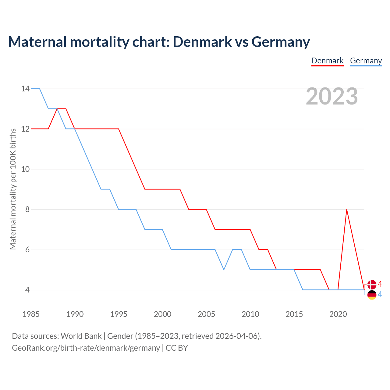 The maternal mortality rate, which is the probability of dying during childbirth or within 42 days of pregnancy termination, is 4 deaths per 100,000 live births in Denmark, compared to 4 deaths in Germany.