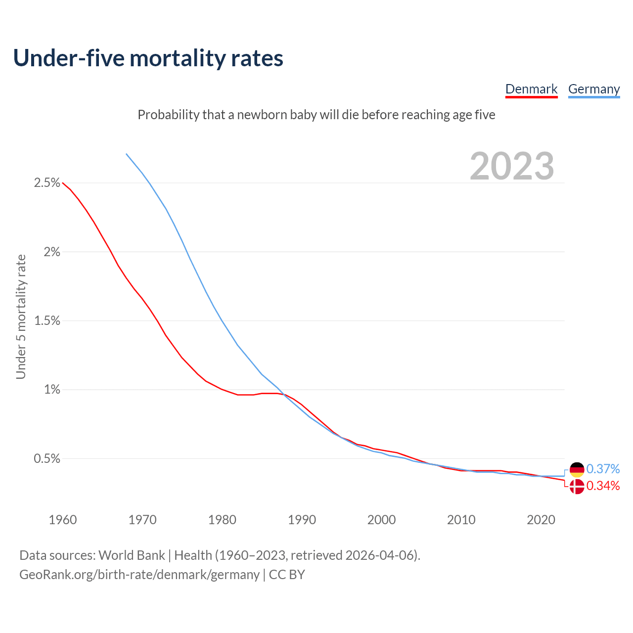 The chance that a newborn baby will die before reaching age five is 0.34% in Denmark and 0.37% in Germany. Above is a chart with historical data on under-five mortality rates.