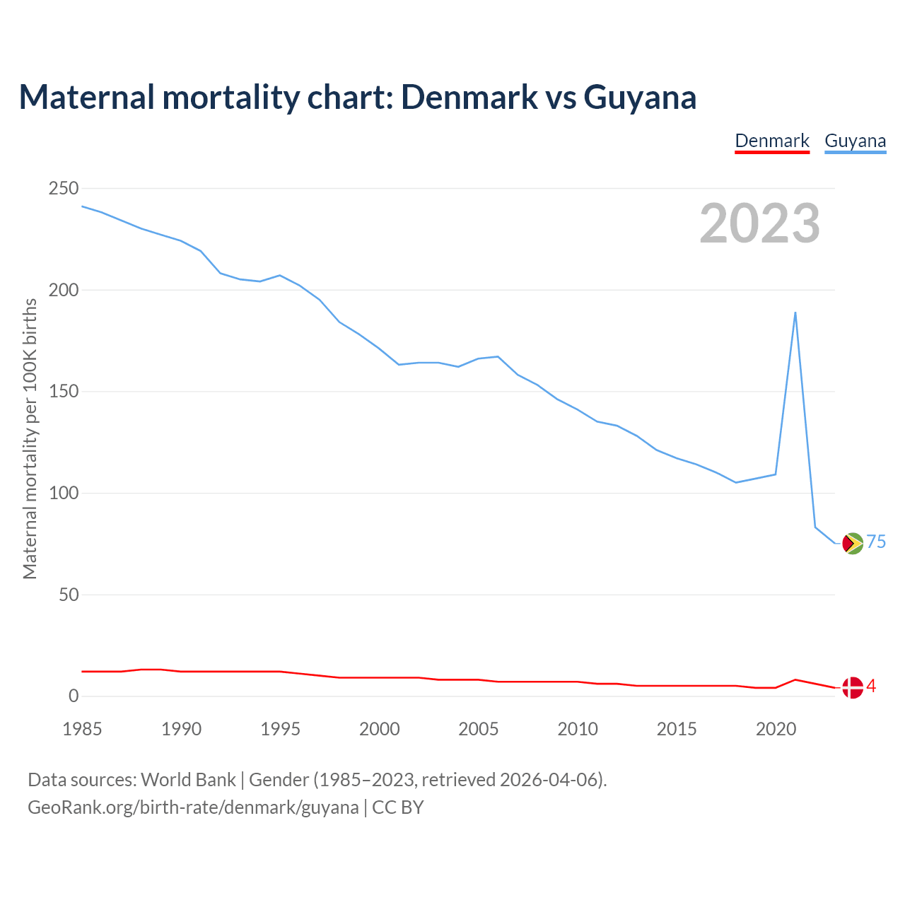 The maternal mortality rate, which is the probability of dying during childbirth or within 42 days of pregnancy termination, is 4 deaths per 100,000 live births in Denmark, compared to 75 deaths in Guyana.