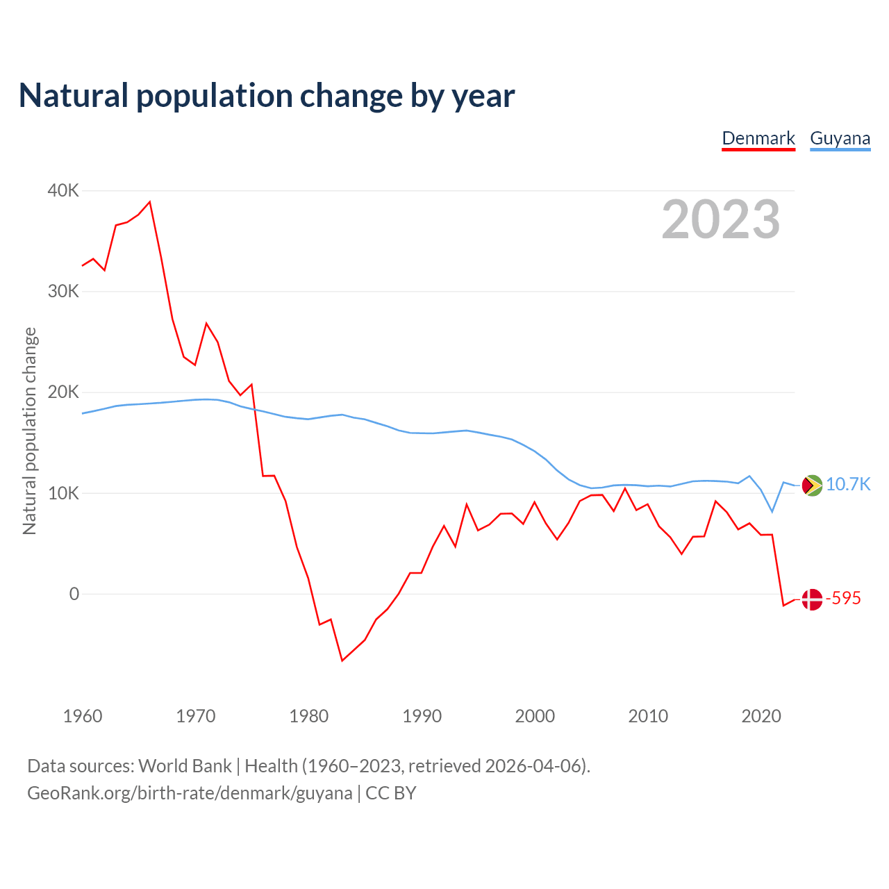 According to the latest available data on birth rates, the fertility rate in Denmark was 1.5 children per woman in 2023, compared to 2.41 in Guyana in 2023. The replacement level is considered to be 2.1 children per woman.