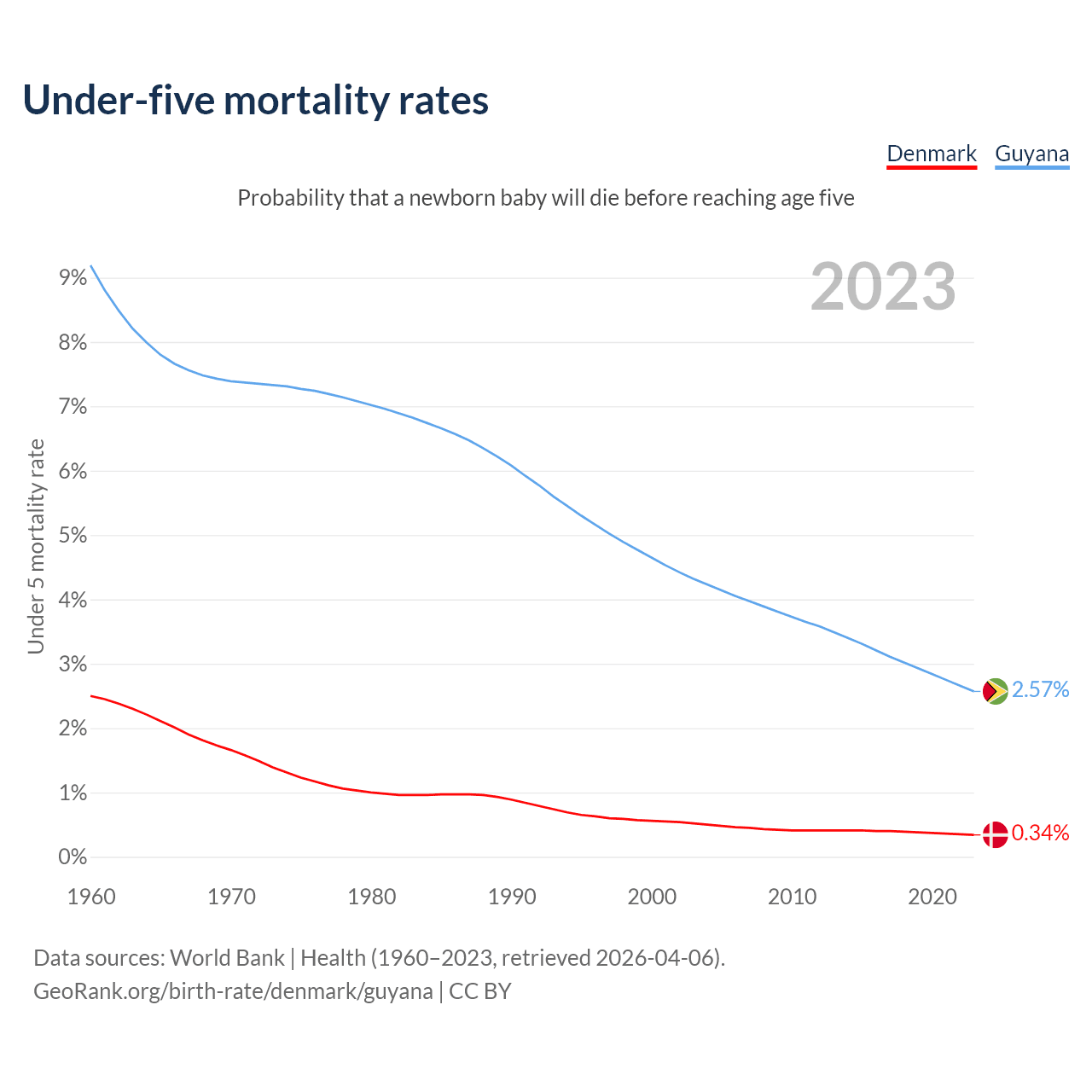 The chance that a newborn baby will die before reaching age five is 0.34% in Denmark and 2.57% in Guyana. Above is a chart with historical data on under-five mortality rates.