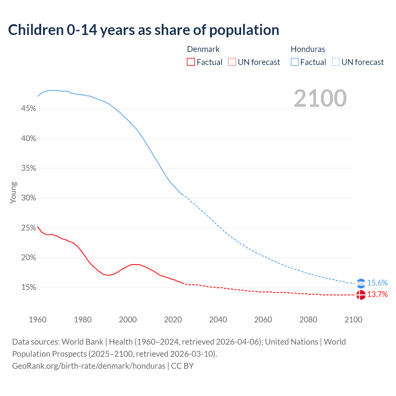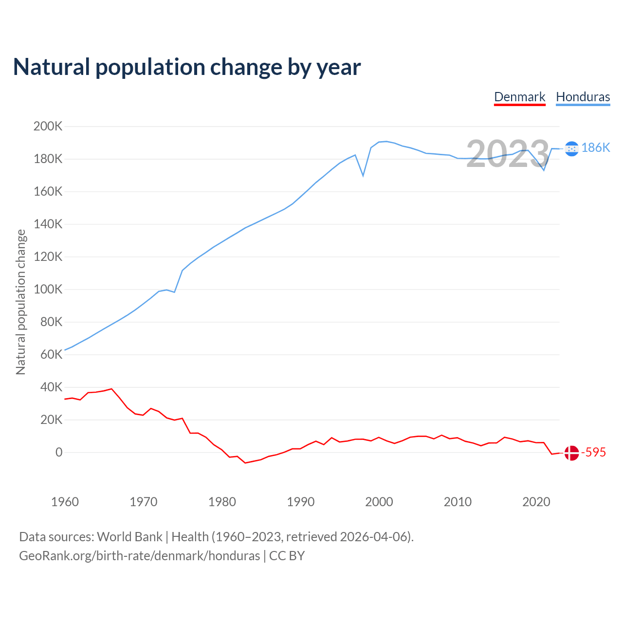 According to the latest available data on birth rates, the fertility rate in Denmark was 1.5 children per woman in 2023, compared to 2.5 in Honduras in 2023. The replacement level is considered to be 2.1 children per woman.