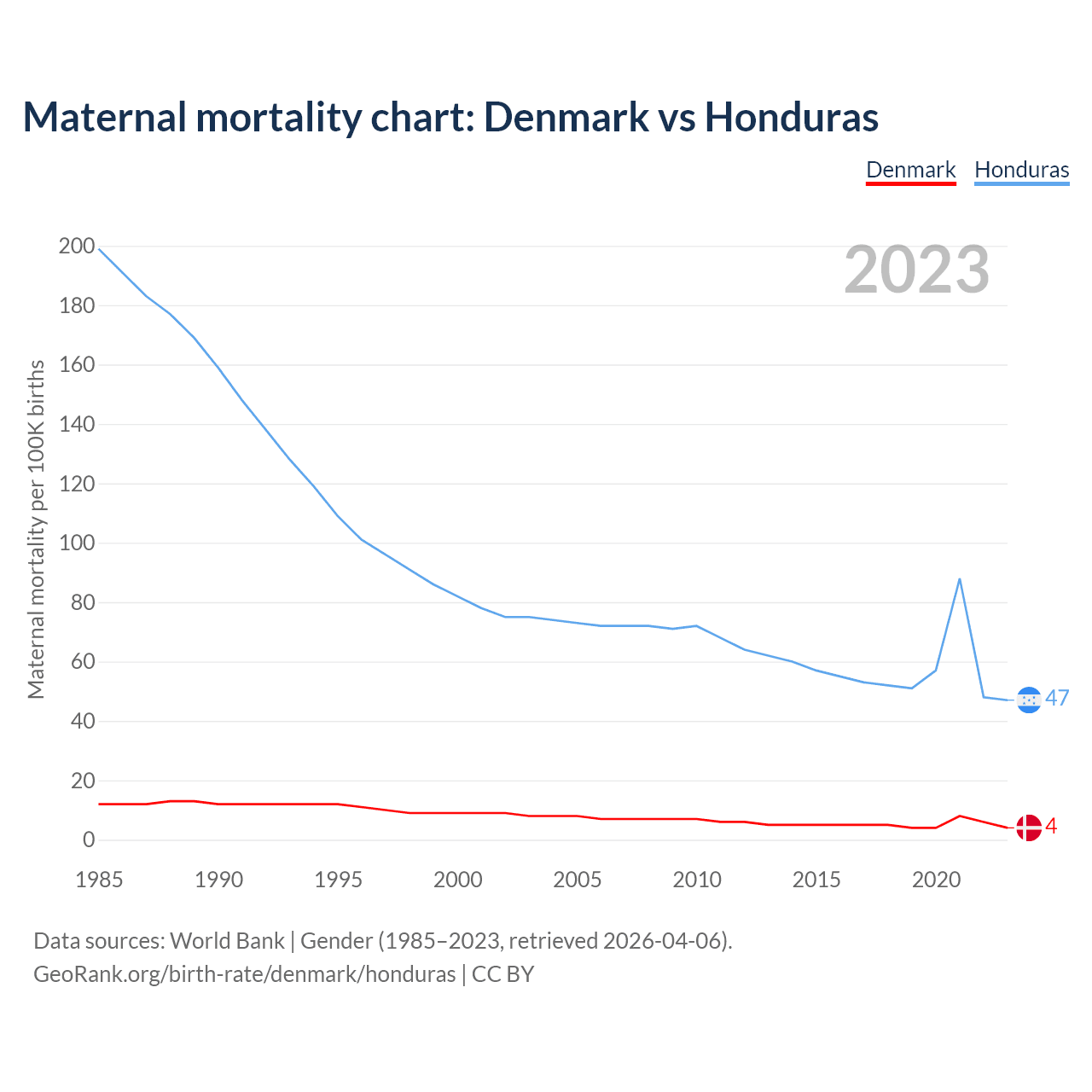The maternal mortality rate, which is the probability of dying during childbirth or within 42 days of pregnancy termination, is 4 deaths per 100,000 live births in Denmark, compared to 47 deaths in Honduras.