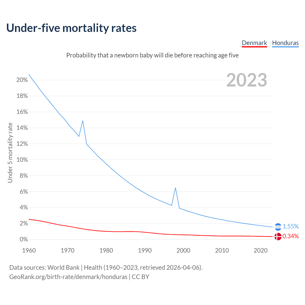 The chance that a newborn baby will die before reaching age five is 0.34% in Denmark and 1.55% in Honduras. Above is a chart with historical data on under-five mortality rates.