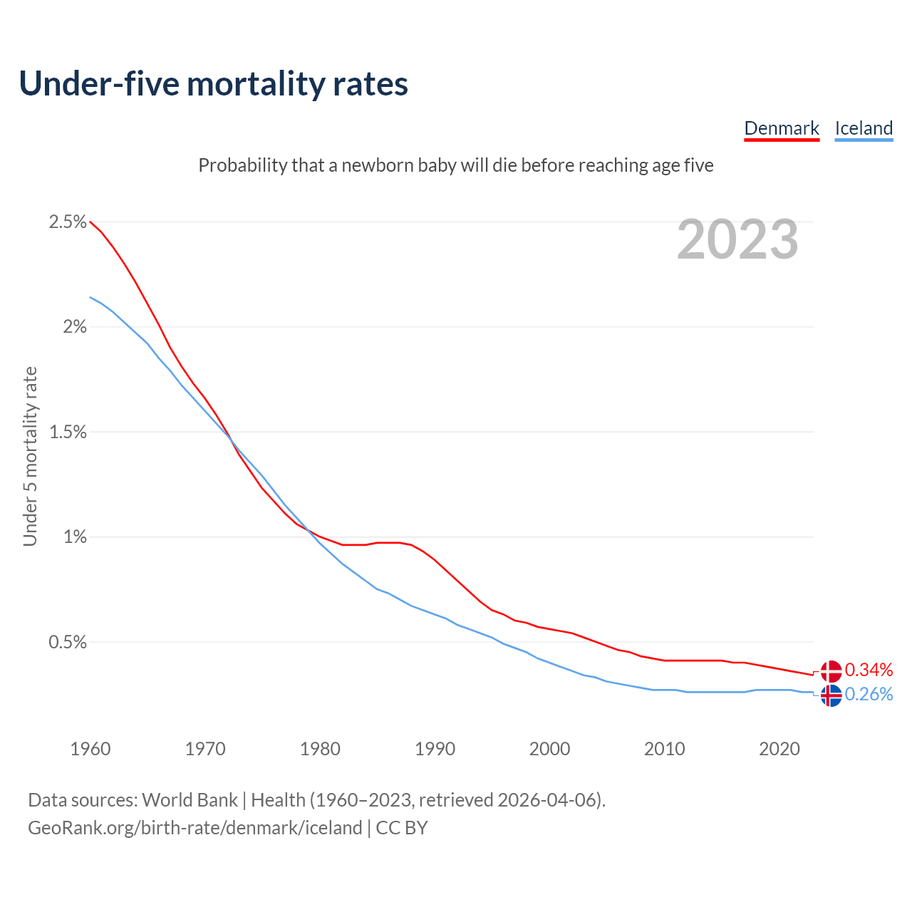 The chance that a newborn baby will die before reaching age five is 0.34% in Denmark and 0.26% in Iceland. Above is a chart with historical data on under-five mortality rates.