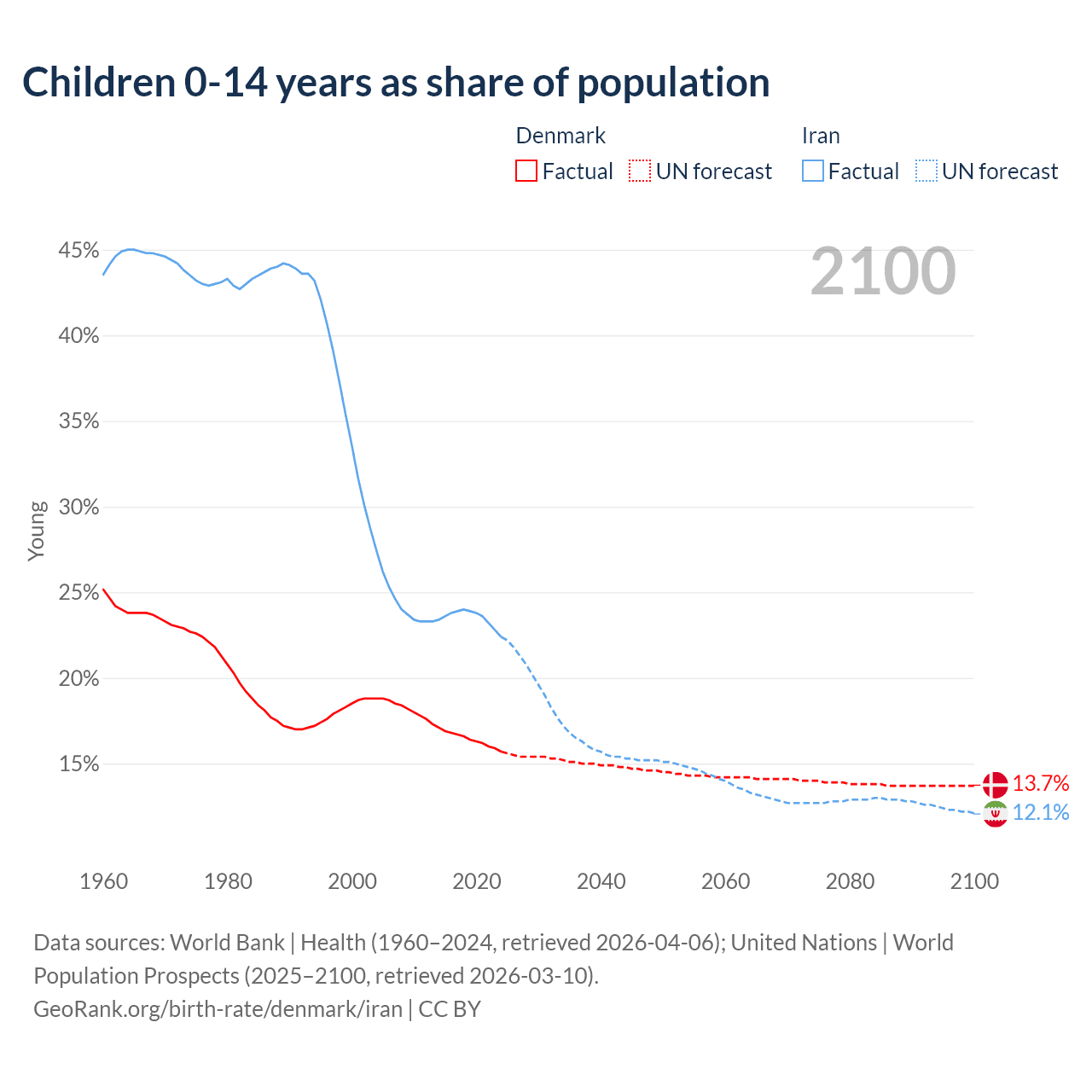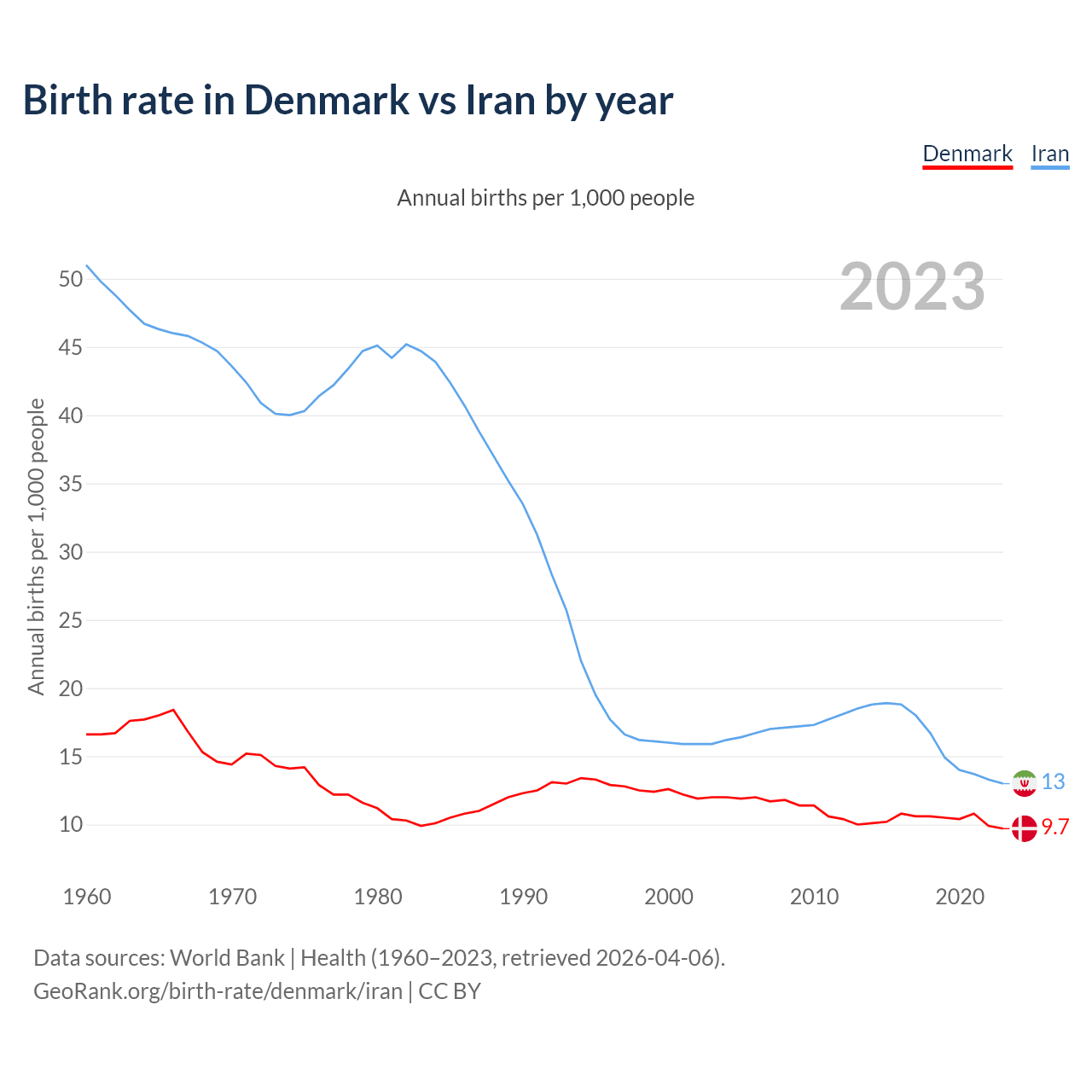 Denmark has an annual birth rate of 9.7 births per 1,000 people, compared to 13 for Iran. The average number of children a woman is expected to have during her lifetime — the fertility rate, is 1.5 in Denmark and 1.7 in Iran — 13% difference.