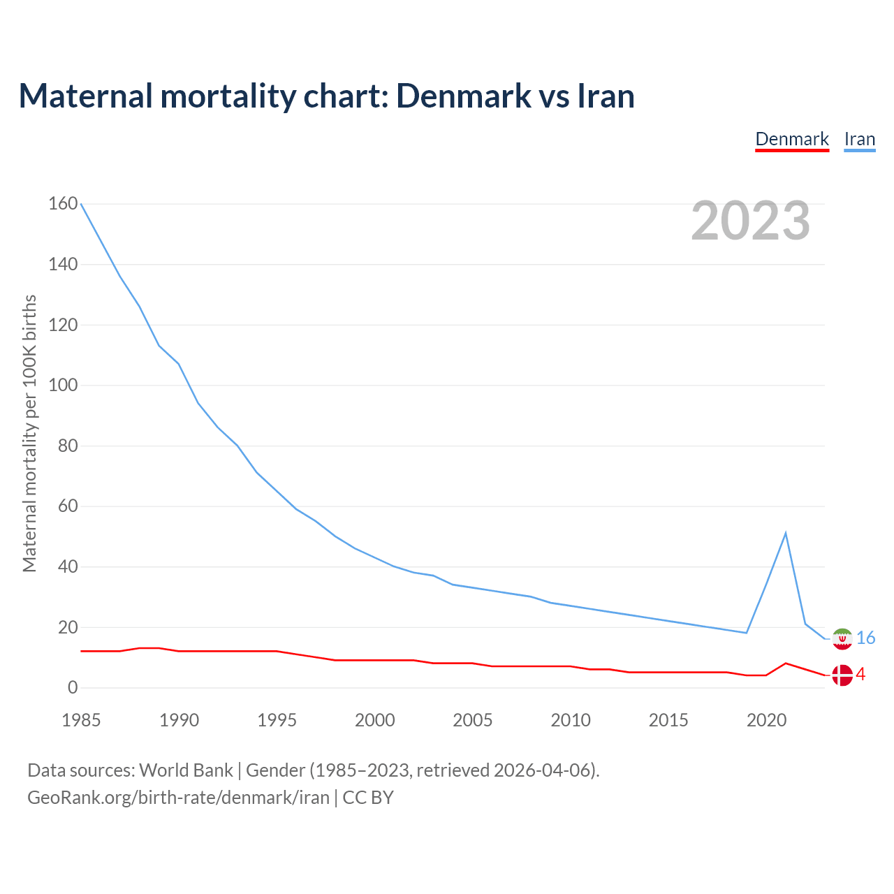 The maternal mortality rate, which is the probability of dying during childbirth or within 42 days of pregnancy termination, is 4 deaths per 100,000 live births in Denmark, compared to 16 deaths in Iran.