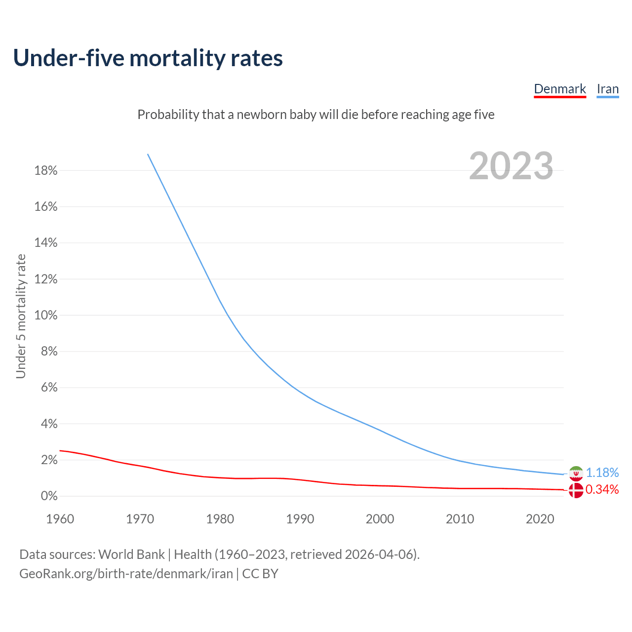 The chance that a newborn baby will die before reaching age five is 0.34% in Denmark and 1.18% in Iran. Above is a chart with historical data on under-five mortality rates.