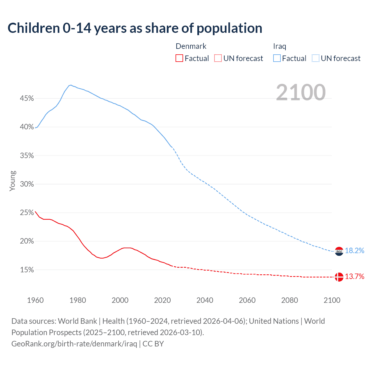 According to the latest available data on birth rates, the fertility rate in Denmark was 1.5 children per woman in 2023, compared to 3.25 in Iraq in 2023. The replacement level is considered to be 2.1 children per woman.