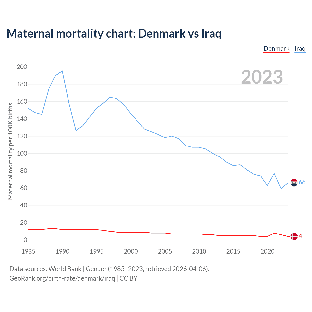 The maternal mortality rate, which is the probability of dying during childbirth or within 42 days of pregnancy termination, is 4 deaths per 100,000 live births in Denmark, compared to 66 deaths in Iraq.