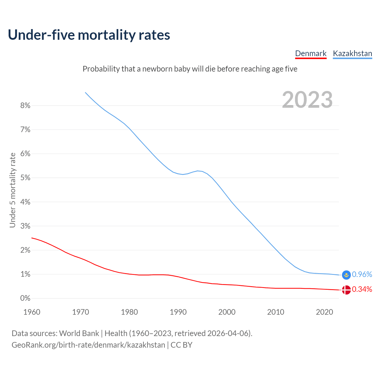 The chance that a newborn baby will die before reaching age five is 0.34% in Denmark and 0.96% in Kazakhstan. Above is a chart with historical data on under-five mortality rates.