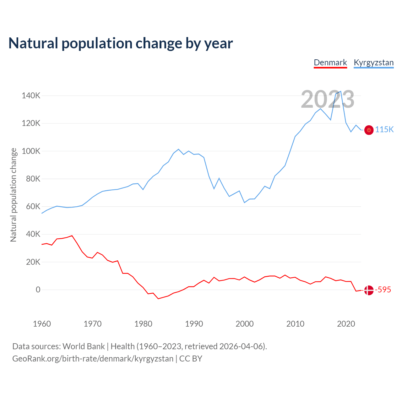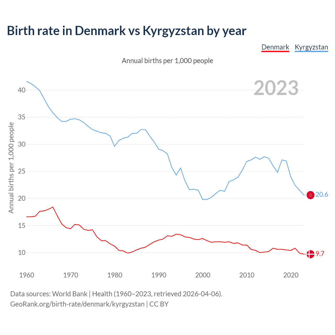 Denmark has an annual birth rate of 9.7 births per 1,000 people, compared to 20.6 for Kyrgyzstan. The average number of children a woman is expected to have during her lifetime — the fertility rate, is 1.5 in Denmark and 2.7 in Kyrgyzstan — 80% difference.