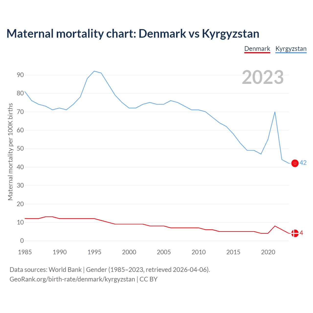 The maternal mortality rate, which is the probability of dying during childbirth or within 42 days of pregnancy termination, is 4 deaths per 100,000 live births in Denmark, compared to 42 deaths in Kyrgyzstan.