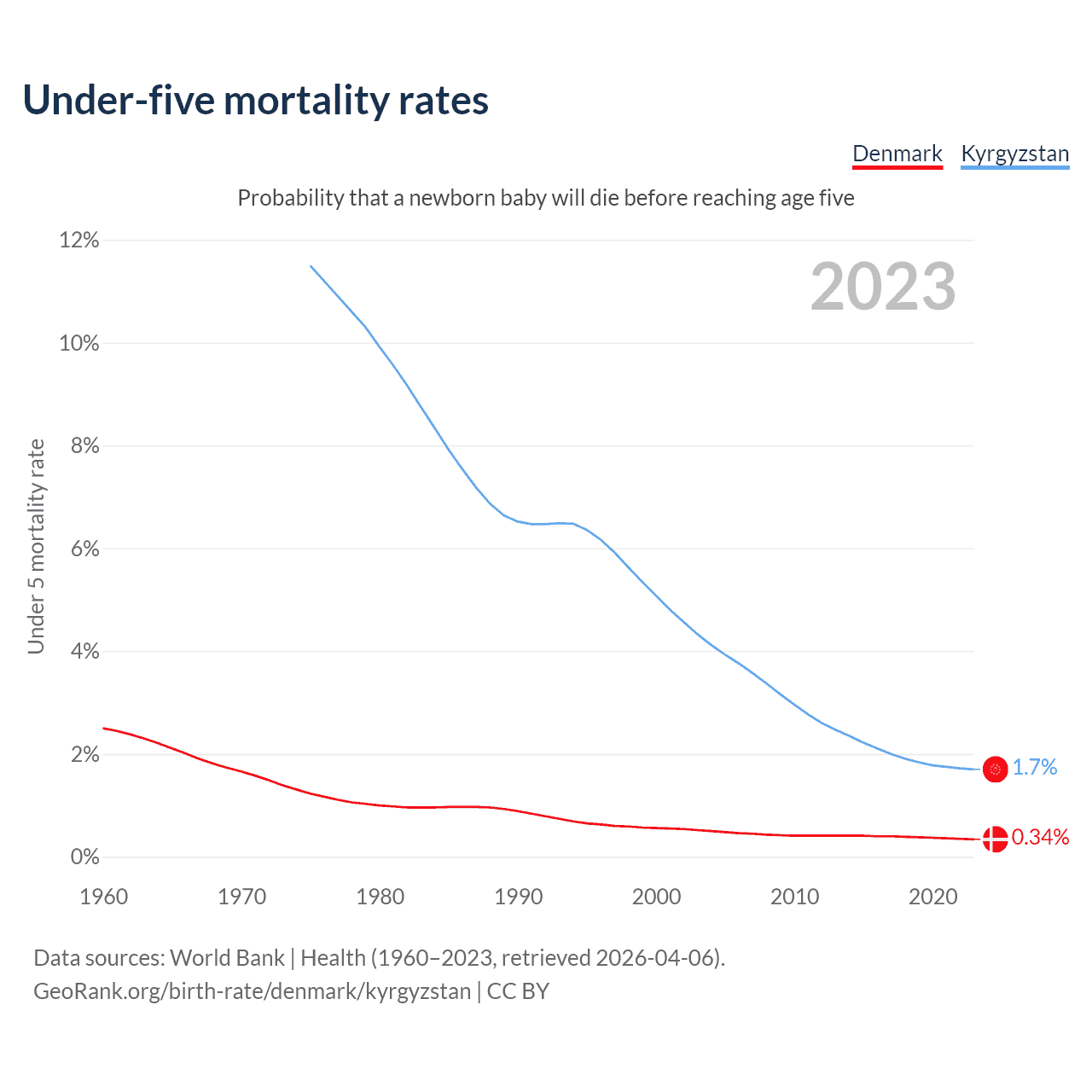 The chance that a newborn baby will die before reaching age five is 0.34% in Denmark and 1.7% in Kyrgyzstan. Above is a chart with historical data on under-five mortality rates.