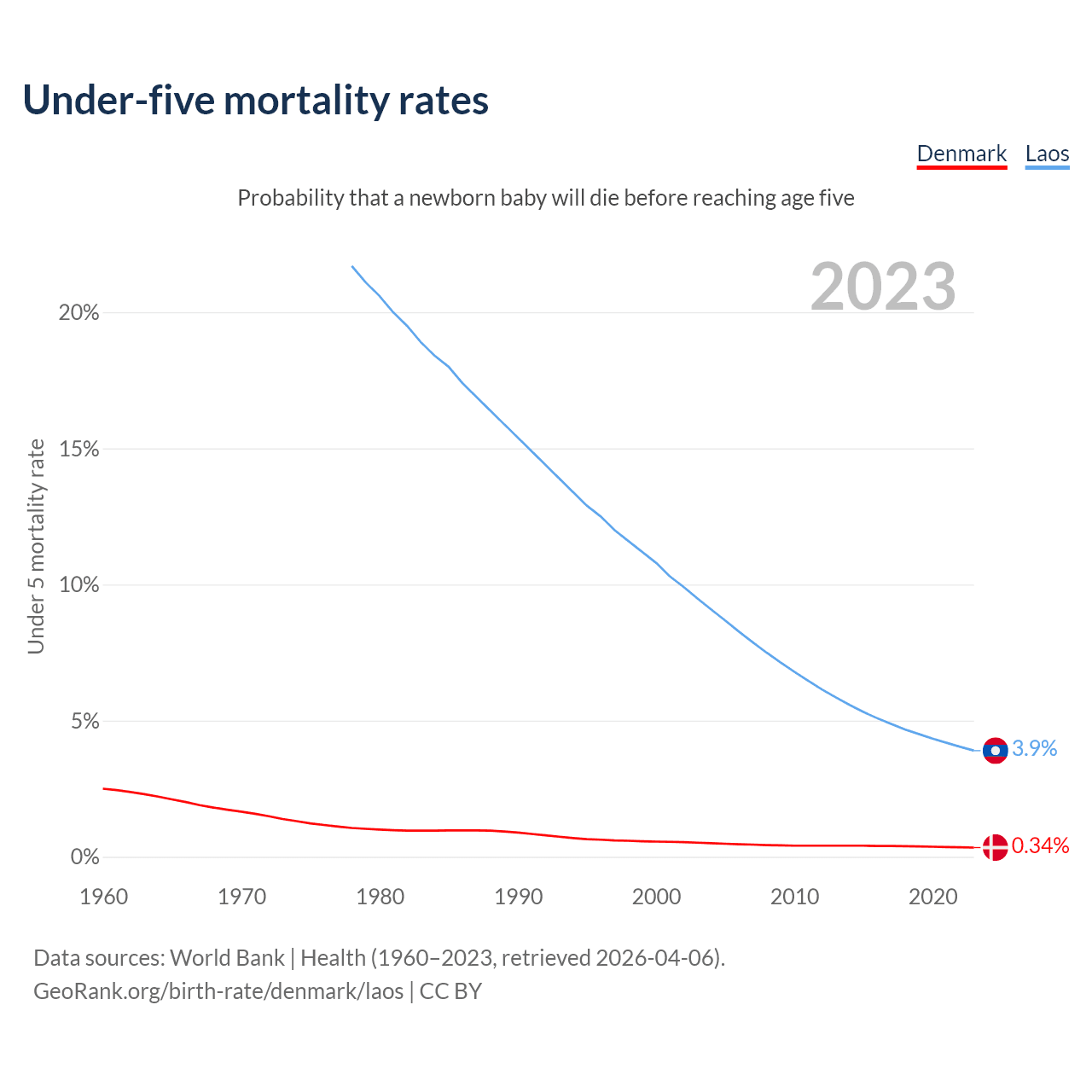 The chance that a newborn baby will die before reaching age five is 0.34% in Denmark and 3.9% in Laos. Above is a chart with historical data on under-five mortality rates.