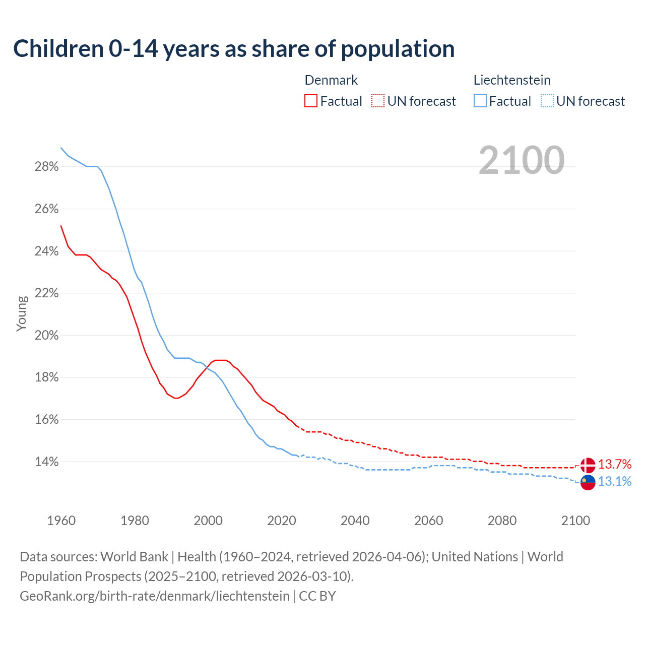 Children aged 0-14 make up 15.7% of the population in Denmark and 14.3% in Liechtenstein in 2024, compared to 17.1% and 19.1% respectively in 1990.
