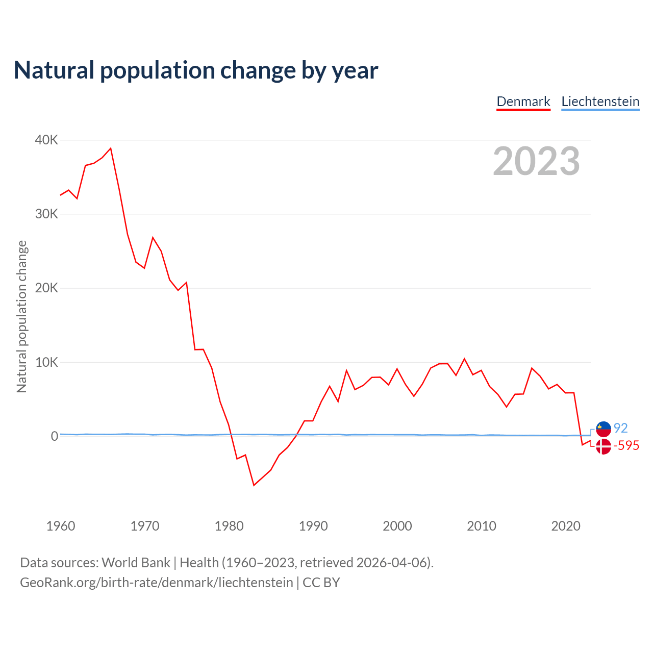 Denmark has an annual birth rate of 9.7 births per 1,000 people, compared to 9.1 for Liechtenstein. The average number of children a woman is expected to have during her lifetime — the fertility rate, is 1.5 in Denmark and 1.45 in Liechtenstein — 3.33% difference.