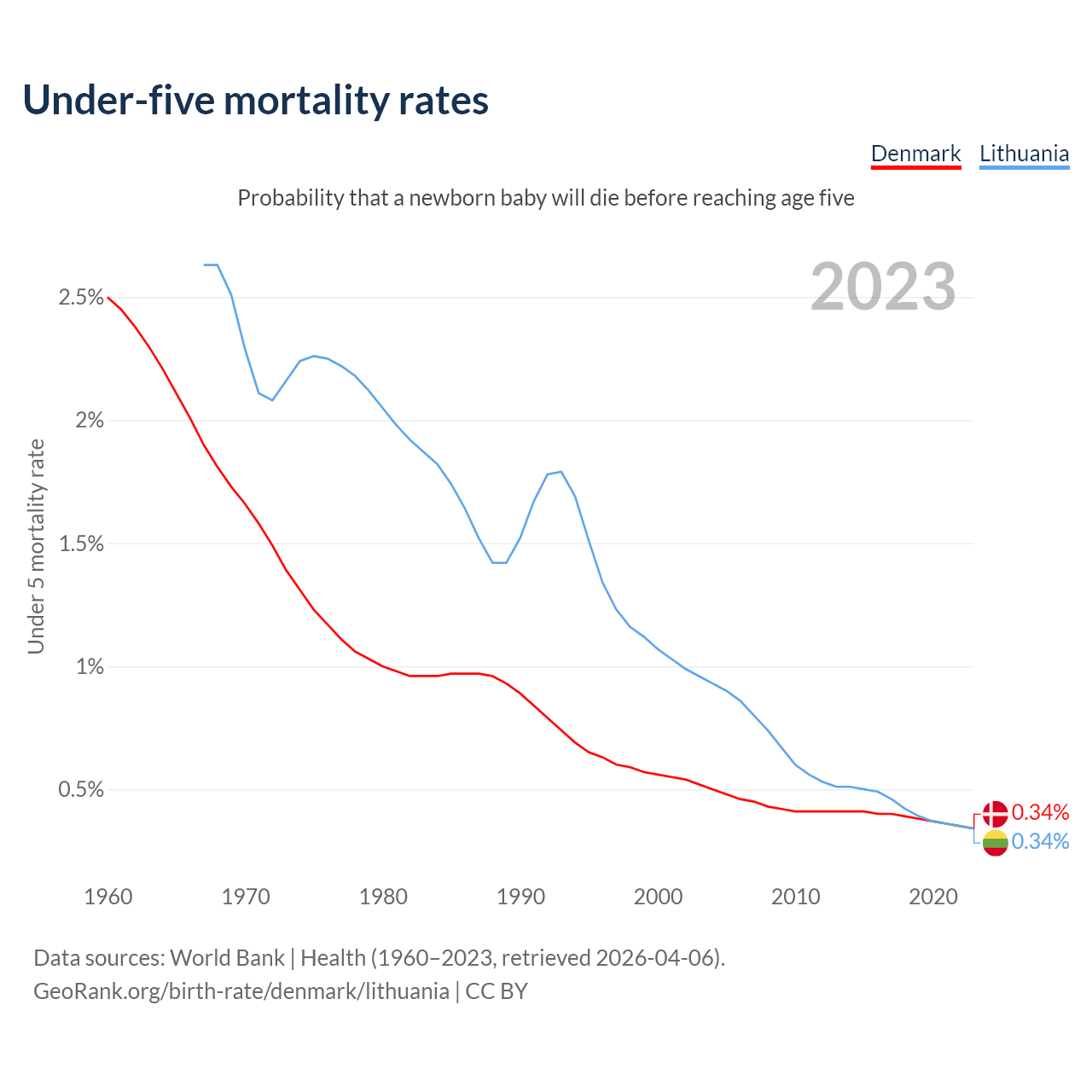 The chance that a newborn baby will die before reaching age five is 0.34% in Denmark and 0.34% in Lithuania. Above is a chart with historical data on under-five mortality rates.