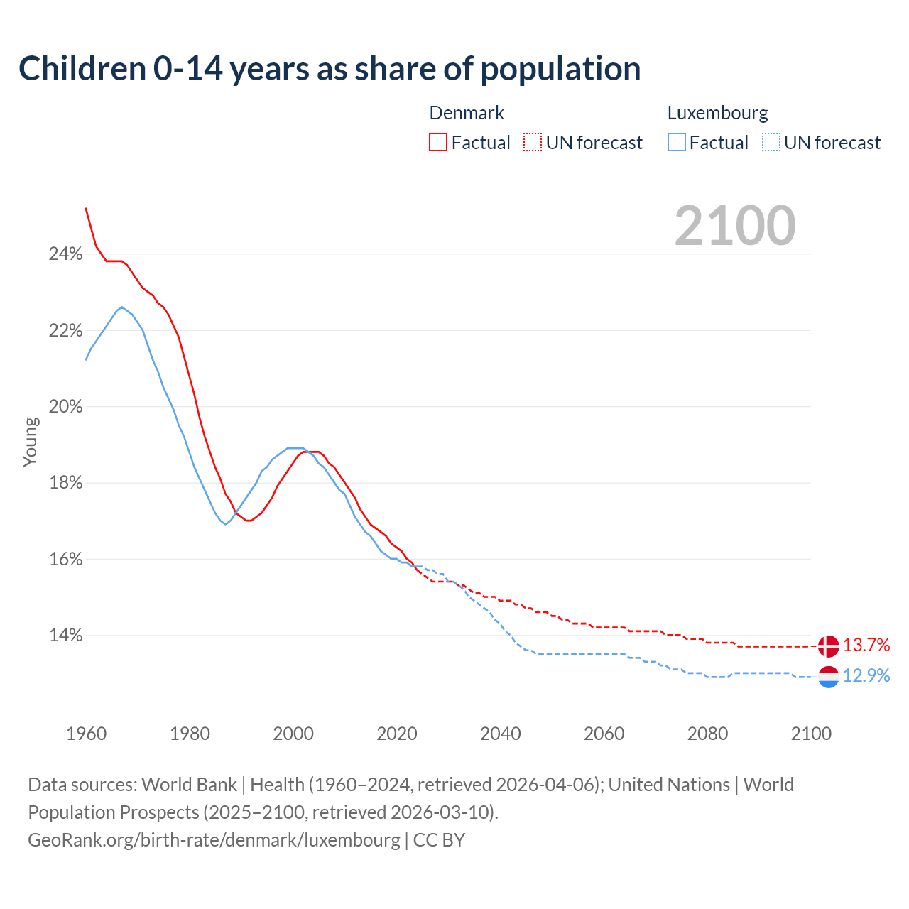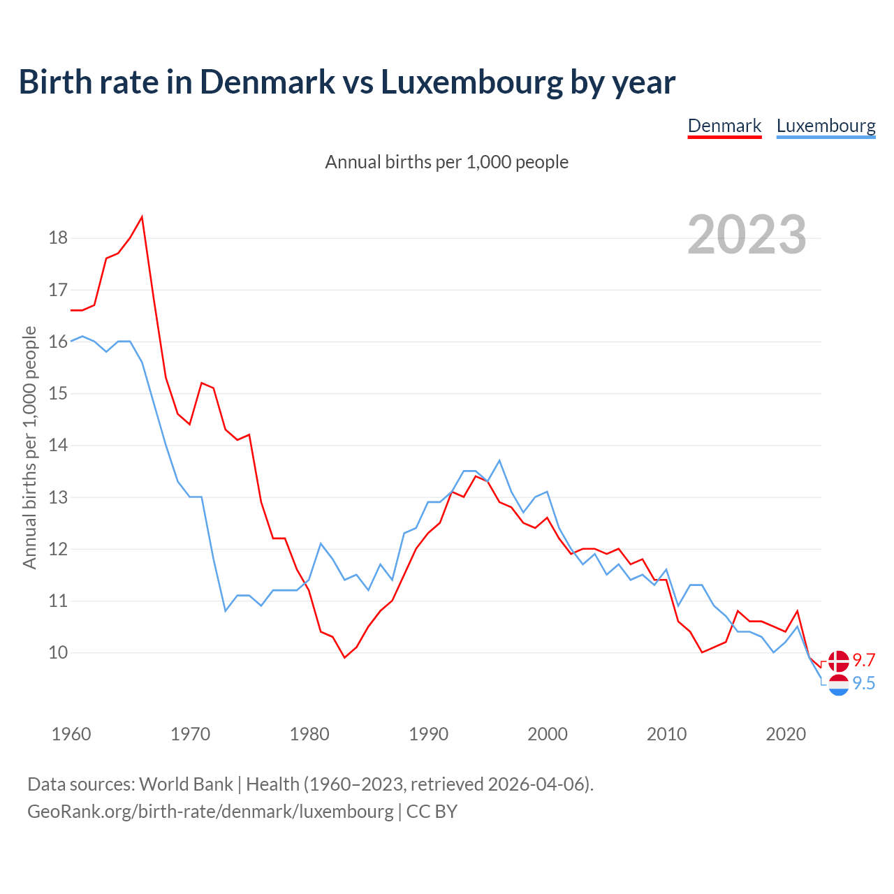Denmark has an annual birth rate of 9.7 births per 1,000 people, compared to 9.5 for Luxembourg. The average number of children a woman is expected to have during her lifetime — the fertility rate, is 1.5 in Denmark and 1.25 in Luxembourg — 16.7% difference.