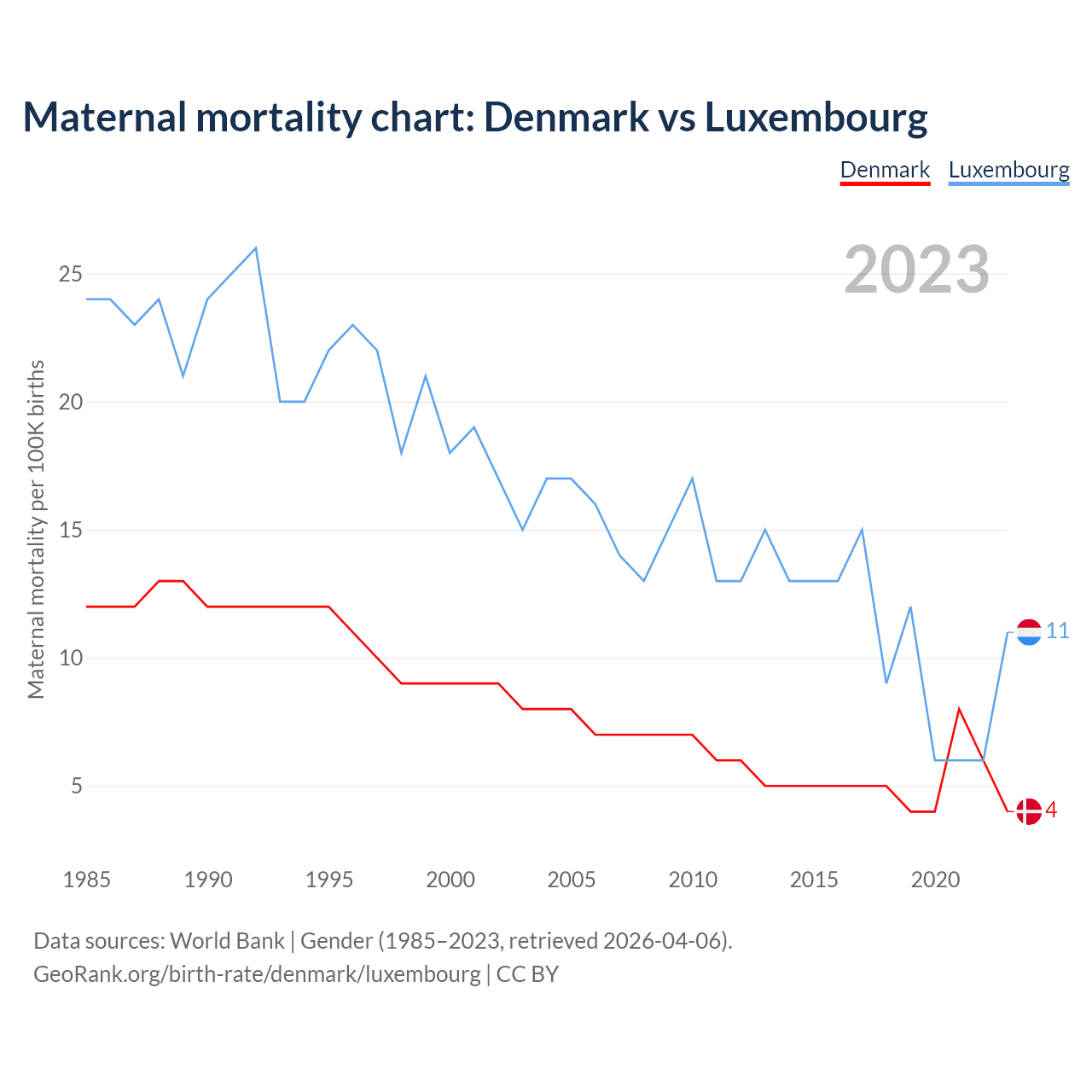 The maternal mortality rate, which is the probability of dying during childbirth or within 42 days of pregnancy termination, is 4 deaths per 100,000 live births in Denmark, compared to 11 deaths in Luxembourg.