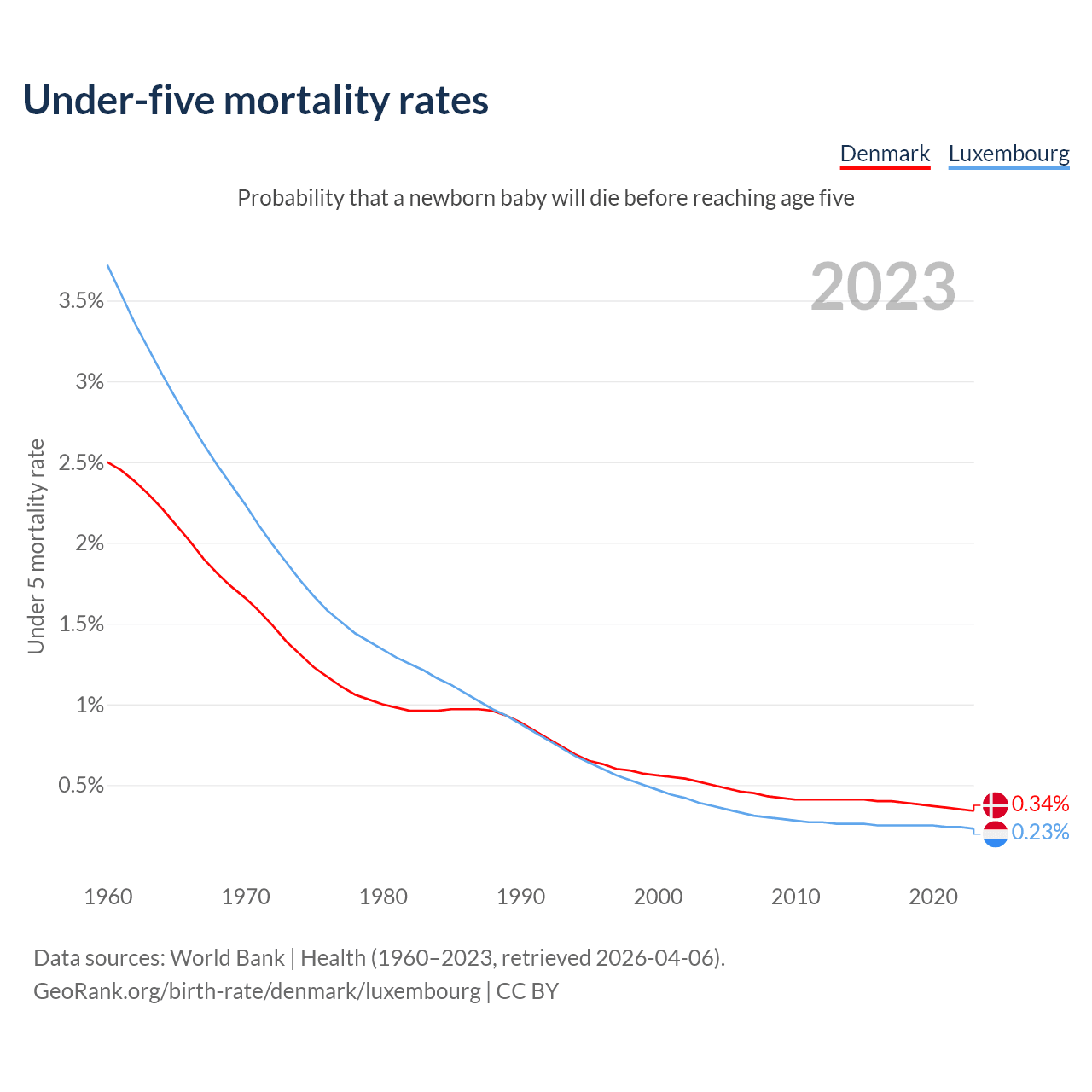 The chance that a newborn baby will die before reaching age five is 0.34% in Denmark and 0.23% in Luxembourg. Above is a chart with historical data on under-five mortality rates.