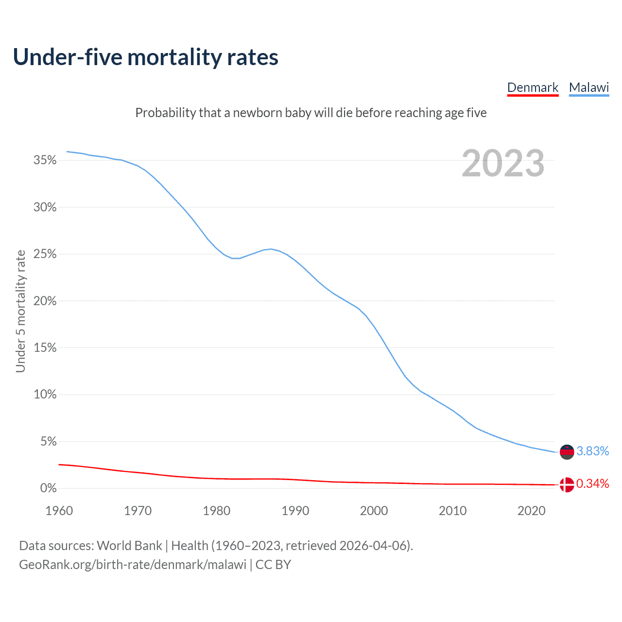 The chance that a newborn baby will die before reaching age five is 0.34% in Denmark and 3.83% in Malawi. Above is a chart with historical data on under-five mortality rates.
