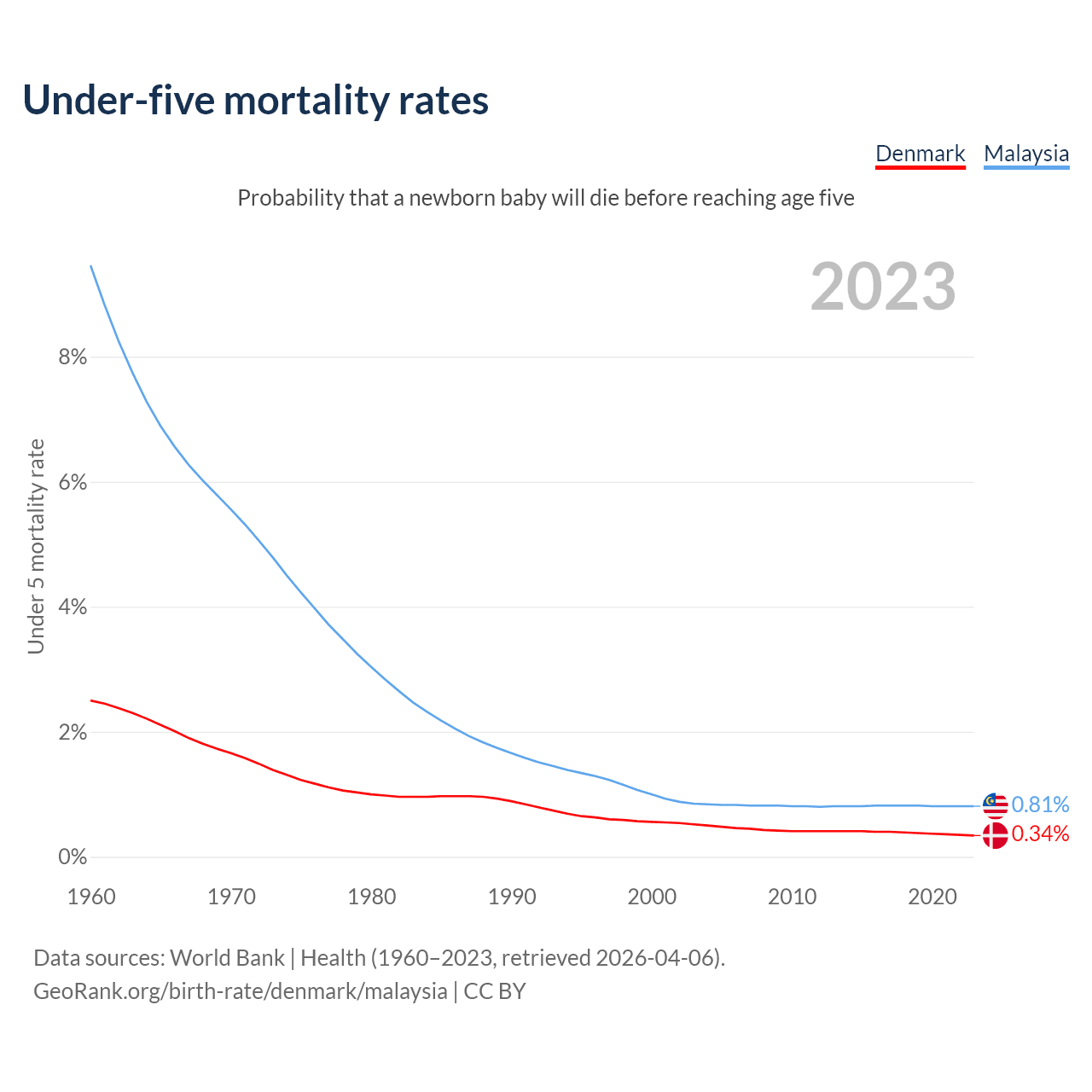 The chance that a newborn baby will die before reaching age five is 0.34% in Denmark and 0.81% in Malaysia. Above is a chart with historical data on under-five mortality rates.