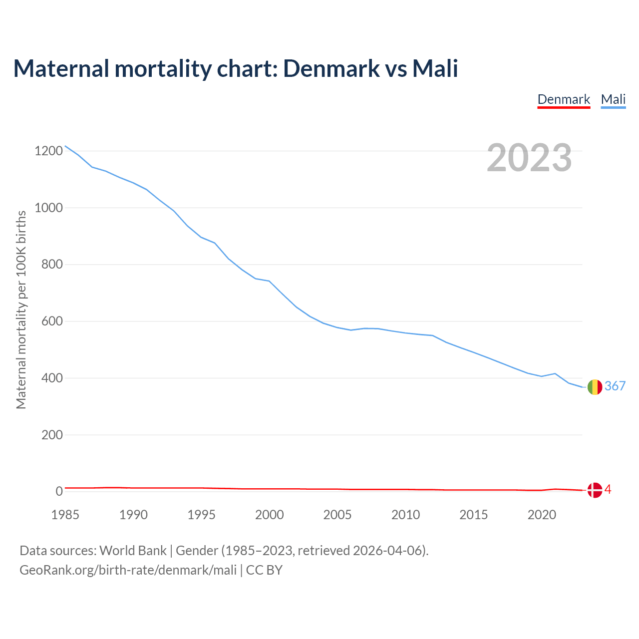The maternal mortality rate, which is the probability of dying during childbirth or within 42 days of pregnancy termination, is 4 deaths per 100,000 live births in Denmark, compared to 367 deaths in Mali.