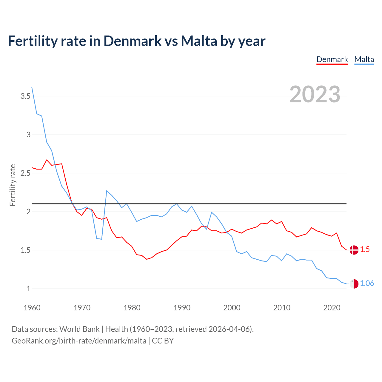 According to the latest available data on birth rates, the fertility rate in Denmark was 1.5 children per woman in 2023, compared to 1.06 in Malta in 2023. The replacement level is considered to be 2.1 children per woman.