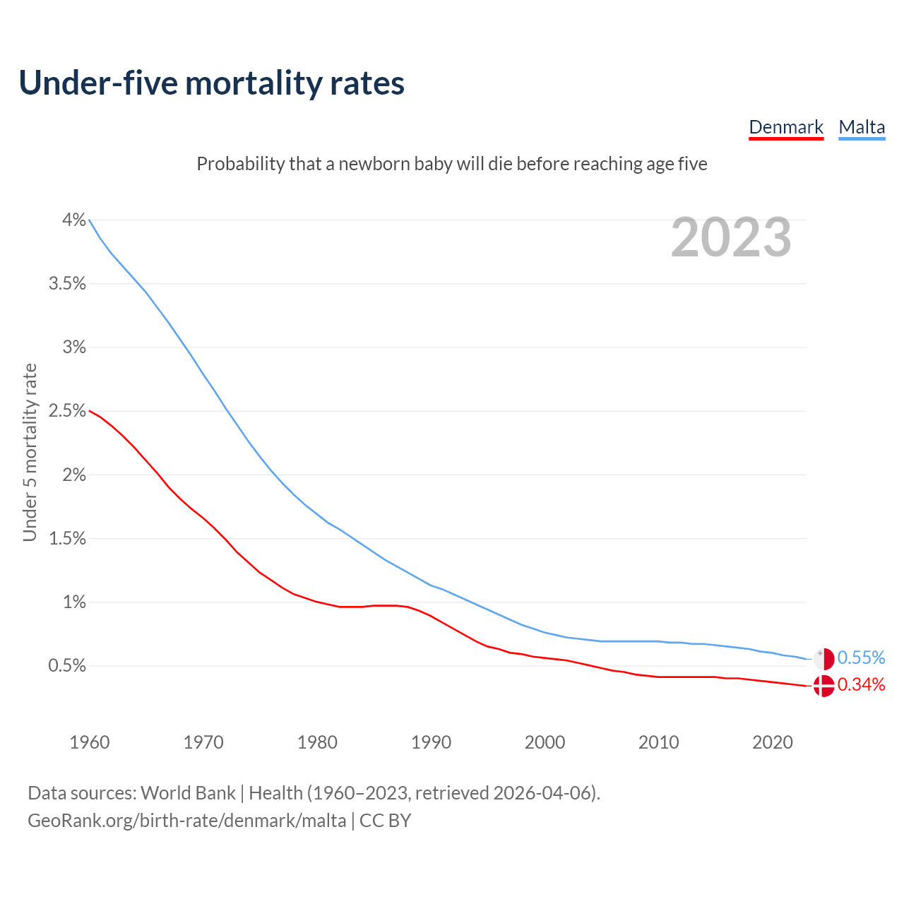 The chance that a newborn baby will die before reaching age five is 0.34% in Denmark and 0.55% in Malta. Above is a chart with historical data on under-five mortality rates.