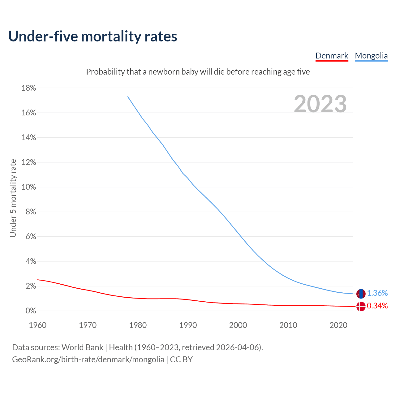 The chance that a newborn baby will die before reaching age five is 0.34% in Denmark and 1.36% in Mongolia. Above is a chart with historical data on under-five mortality rates.