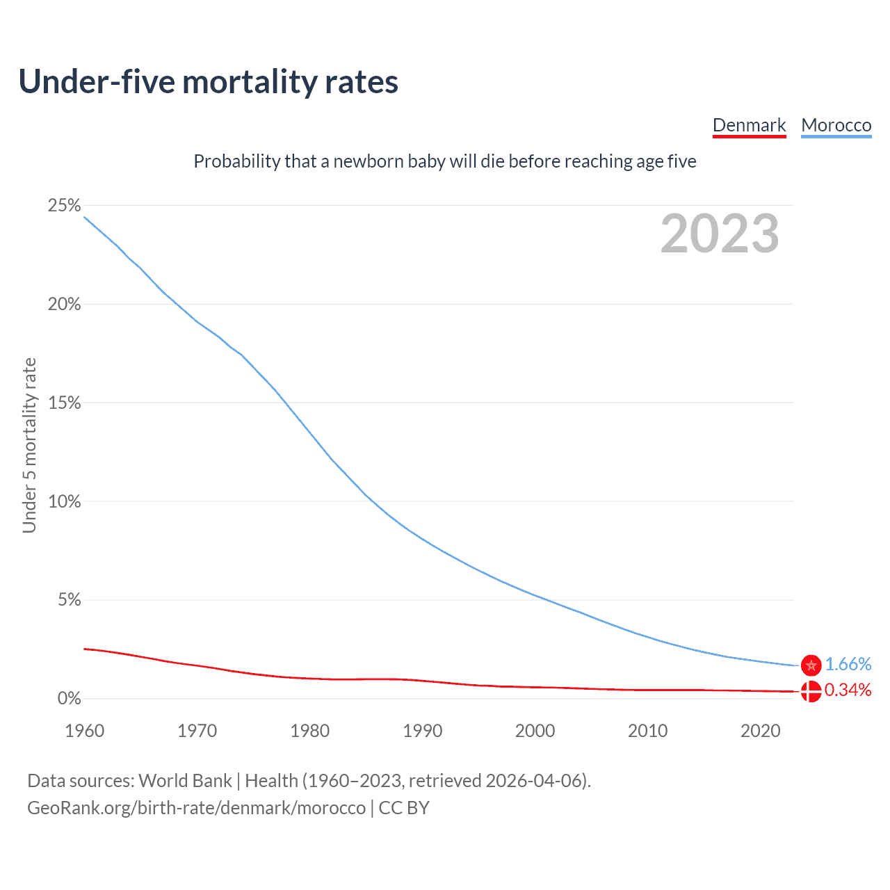 The chance that a newborn baby will die before reaching age five is 0.34% in Denmark and 1.66% in Morocco. Above is a chart with historical data on under-five mortality rates.