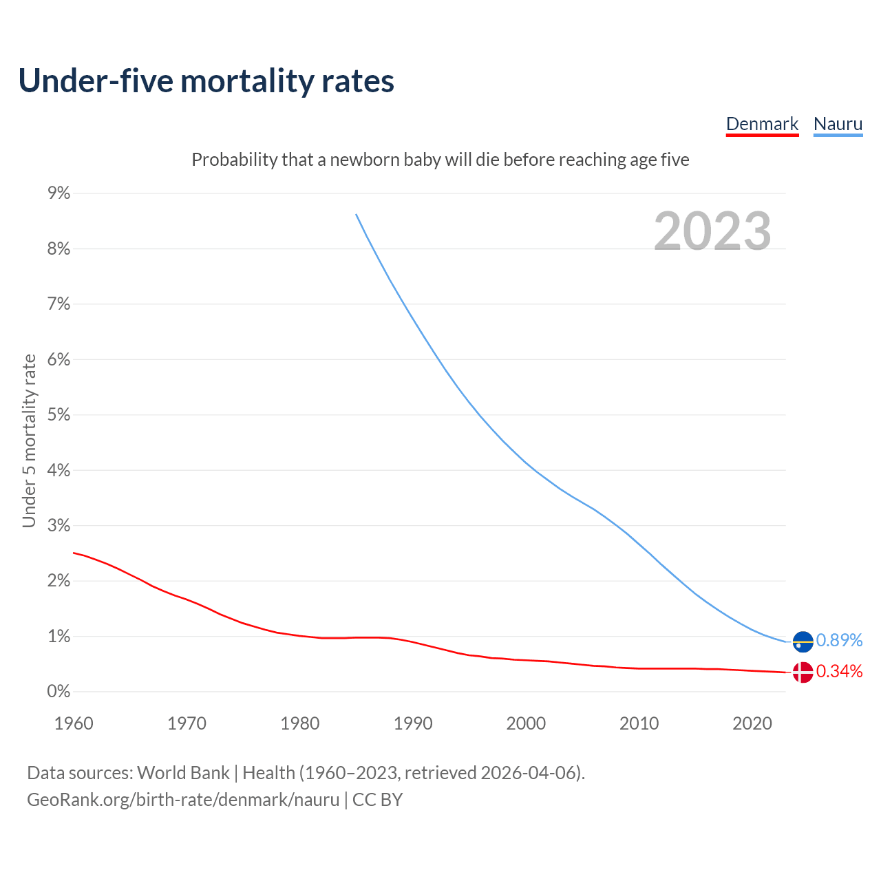 The chance that a newborn baby will die before reaching age five is 0.34% in Denmark and 0.89% in Nauru. Above is a chart with historical data on under-five mortality rates.