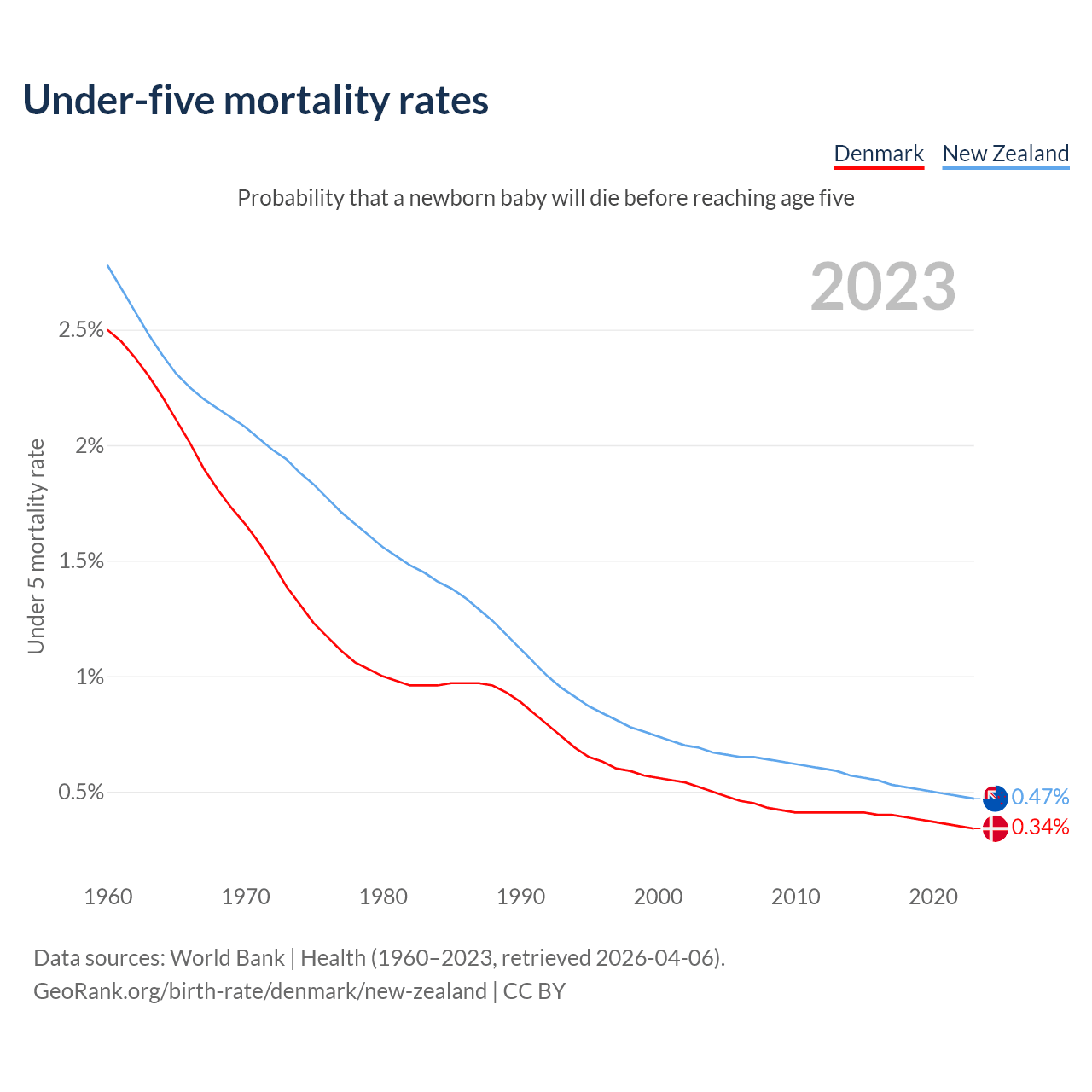 The chance that a newborn baby will die before reaching age five is 0.34% in Denmark and 0.47% in New Zealand. Above is a chart with historical data on under-five mortality rates.