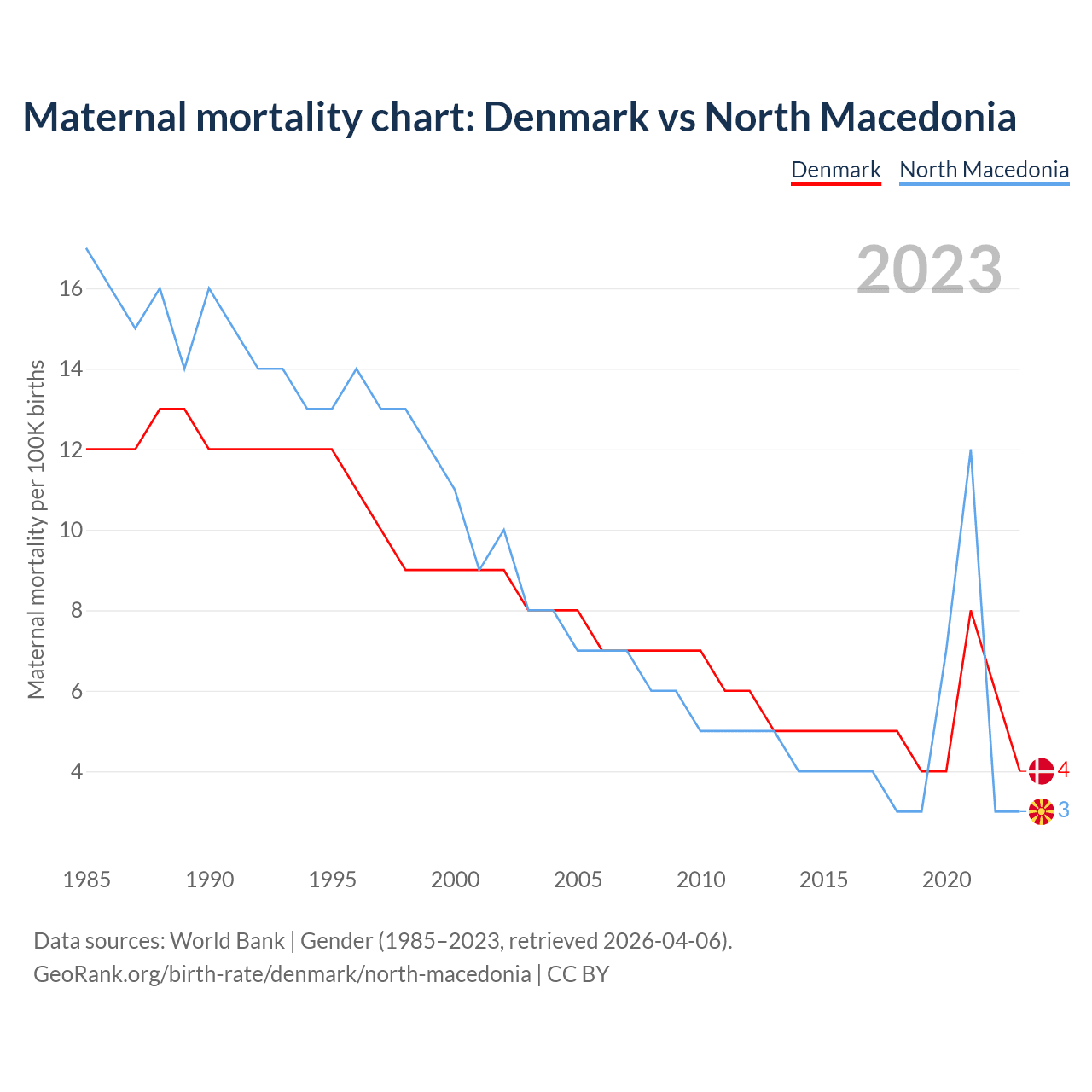 The maternal mortality rate, which is the probability of dying during childbirth or within 42 days of pregnancy termination, is 4 deaths per 100,000 live births in Denmark, compared to 3 deaths in North Macedonia.