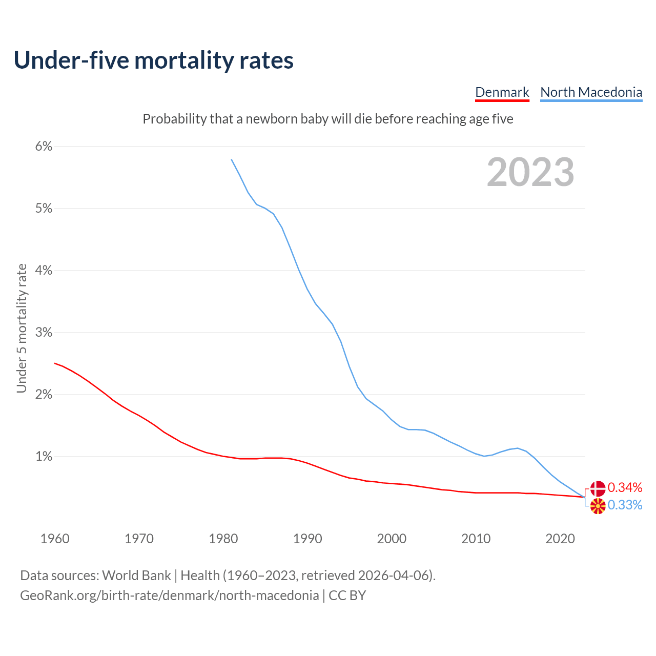 The chance that a newborn baby will die before reaching age five is 0.34% in Denmark and 0.33% in North Macedonia. Above is a chart with historical data on under-five mortality rates.