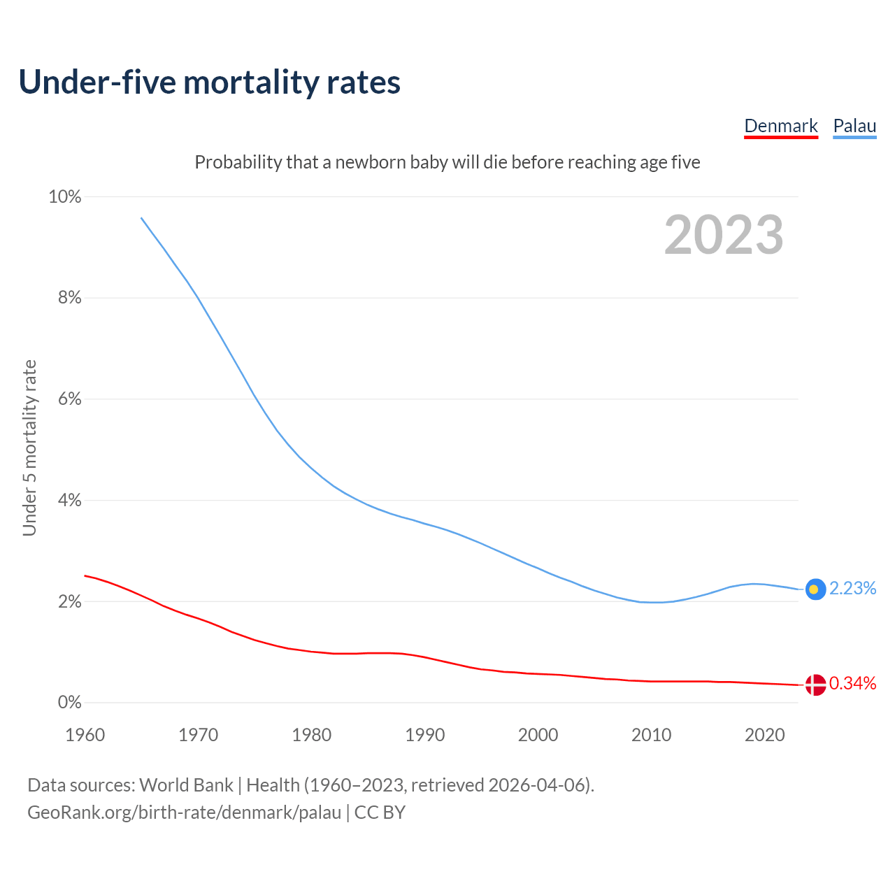 The chance that a newborn baby will die before reaching age five is 0.34% in Denmark and 2.23% in Palau. Above is a chart with historical data on under-five mortality rates.