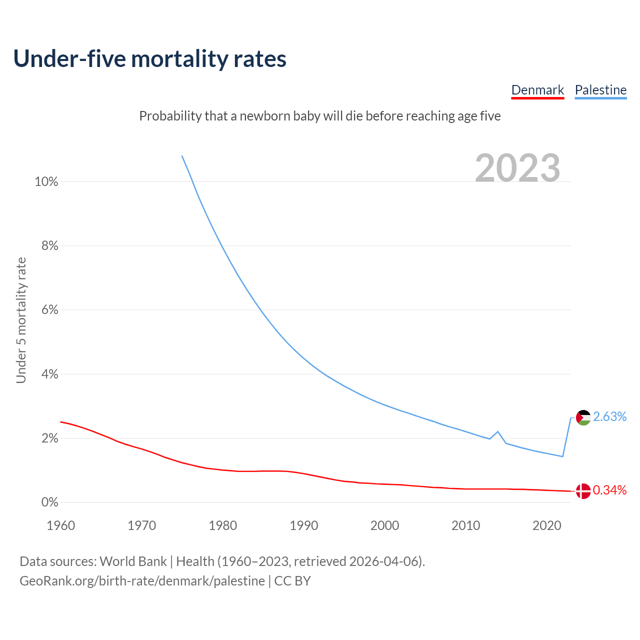 The chance that a newborn baby will die before reaching age five is 0.34% in Denmark and 2.63% in Palestine. Above is a chart with historical data on under-five mortality rates.