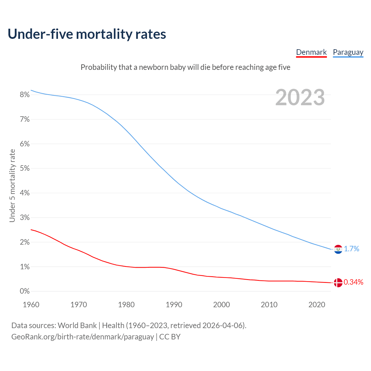 The chance that a newborn baby will die before reaching age five is 0.34% in Denmark and 1.7% in Paraguay. Above is a chart with historical data on under-five mortality rates.