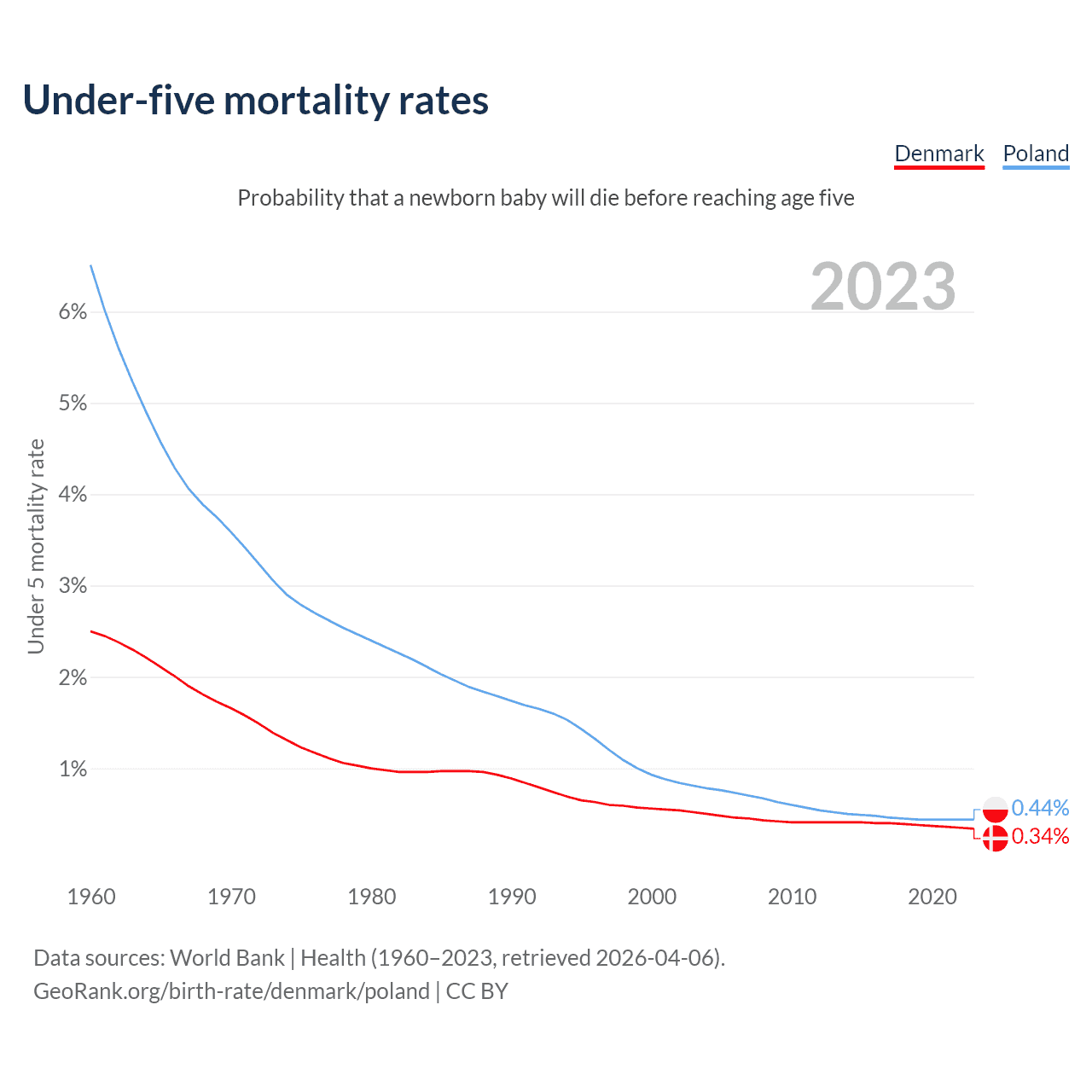 The chance that a newborn baby will die before reaching age five is 0.34% in Denmark and 0.44% in Poland. Above is a chart with historical data on under-five mortality rates.