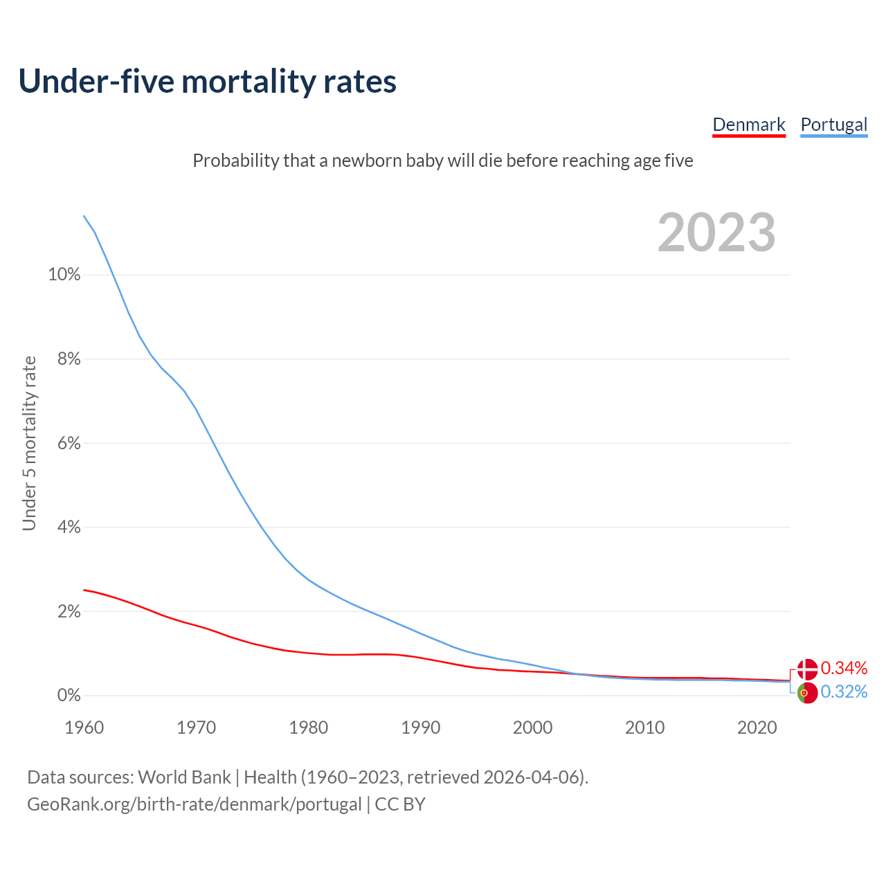 The chance that a newborn baby will die before reaching age five is 0.34% in Denmark and 0.32% in Portugal. Above is a chart with historical data on under-five mortality rates.