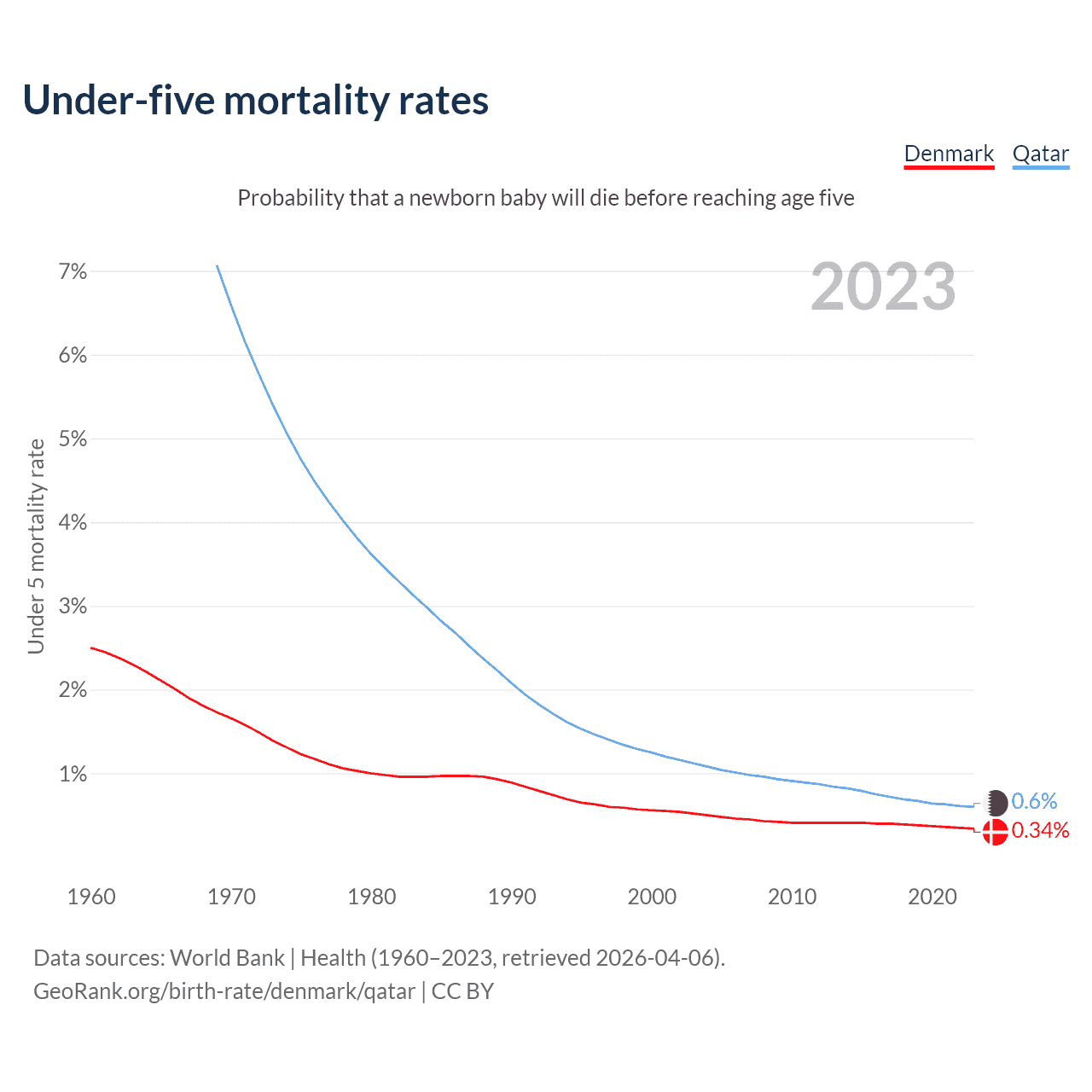 The chance that a newborn baby will die before reaching age five is 0.34% in Denmark and 0.6% in Qatar. Above is a chart with historical data on under-five mortality rates.