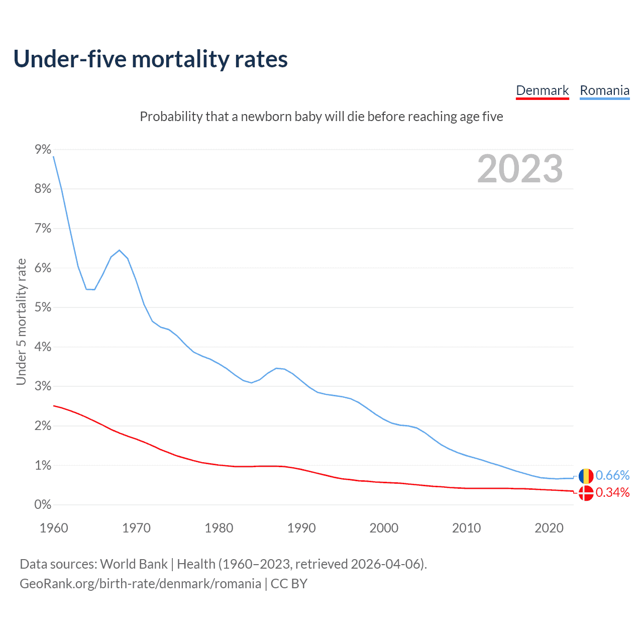 The chance that a newborn baby will die before reaching age five is 0.34% in Denmark and 0.66% in Romania. Above is a chart with historical data on under-five mortality rates.