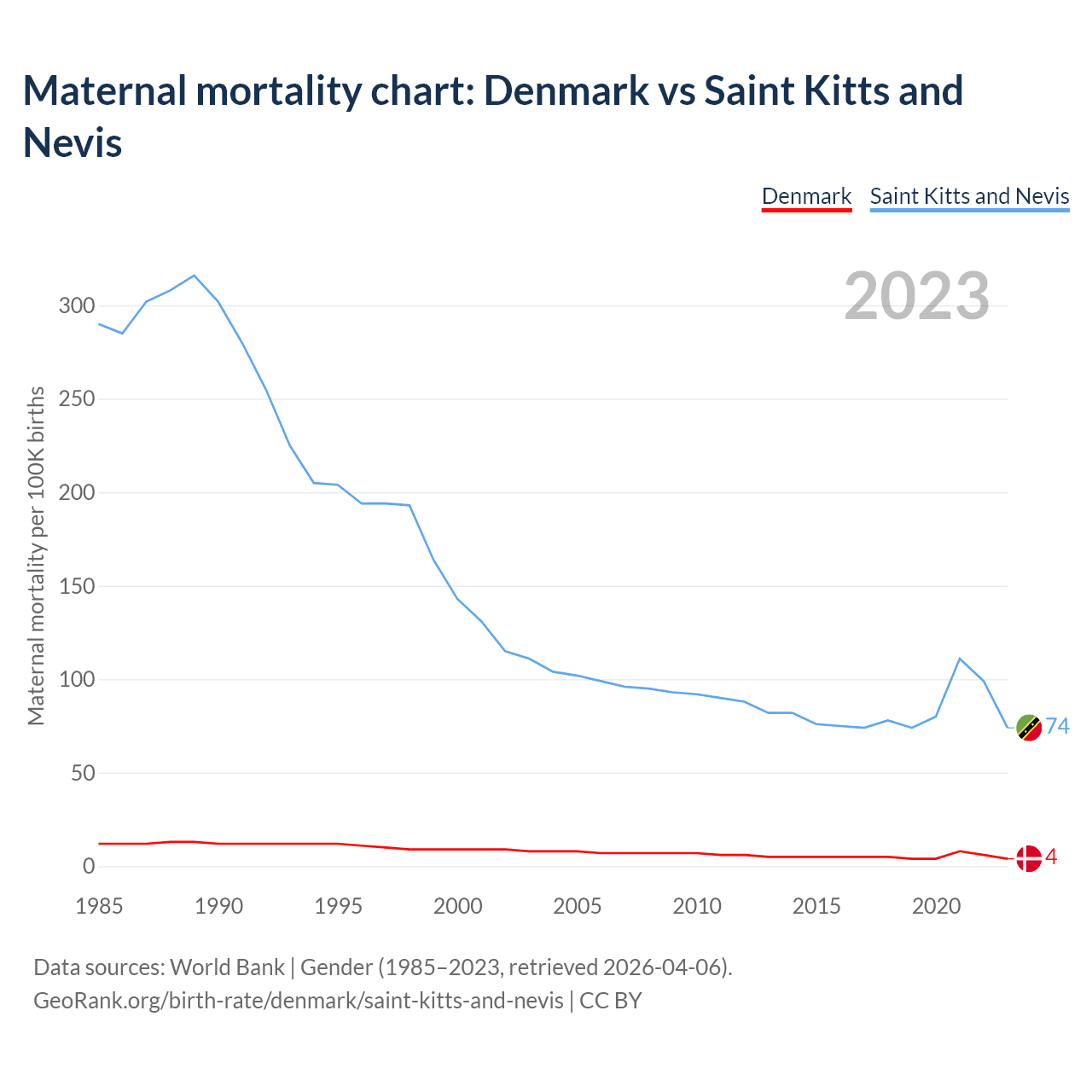 The maternal mortality rate, which is the probability of dying during childbirth or within 42 days of pregnancy termination, is 4 deaths per 100,000 live births in Denmark, compared to 74 deaths in Saint Kitts and Nevis.