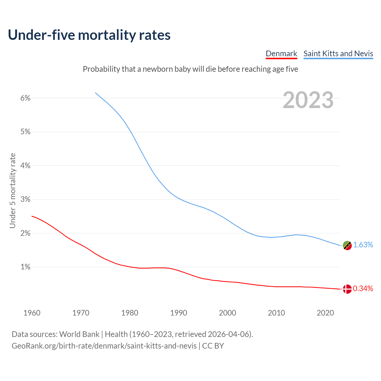The chance that a newborn baby will die before reaching age five is 0.34% in Denmark and 1.63% in Saint Kitts and Nevis. Above is a chart with historical data on under-five mortality rates.