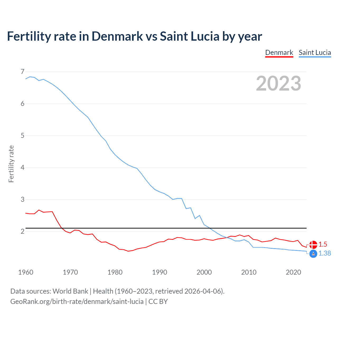 1960 vs 2023, the fertility rate has decreased by 41.6% in Denmark and by 79.6% in Saint Lucia — in 1960, it was 2.57 and 6.77, respectively.