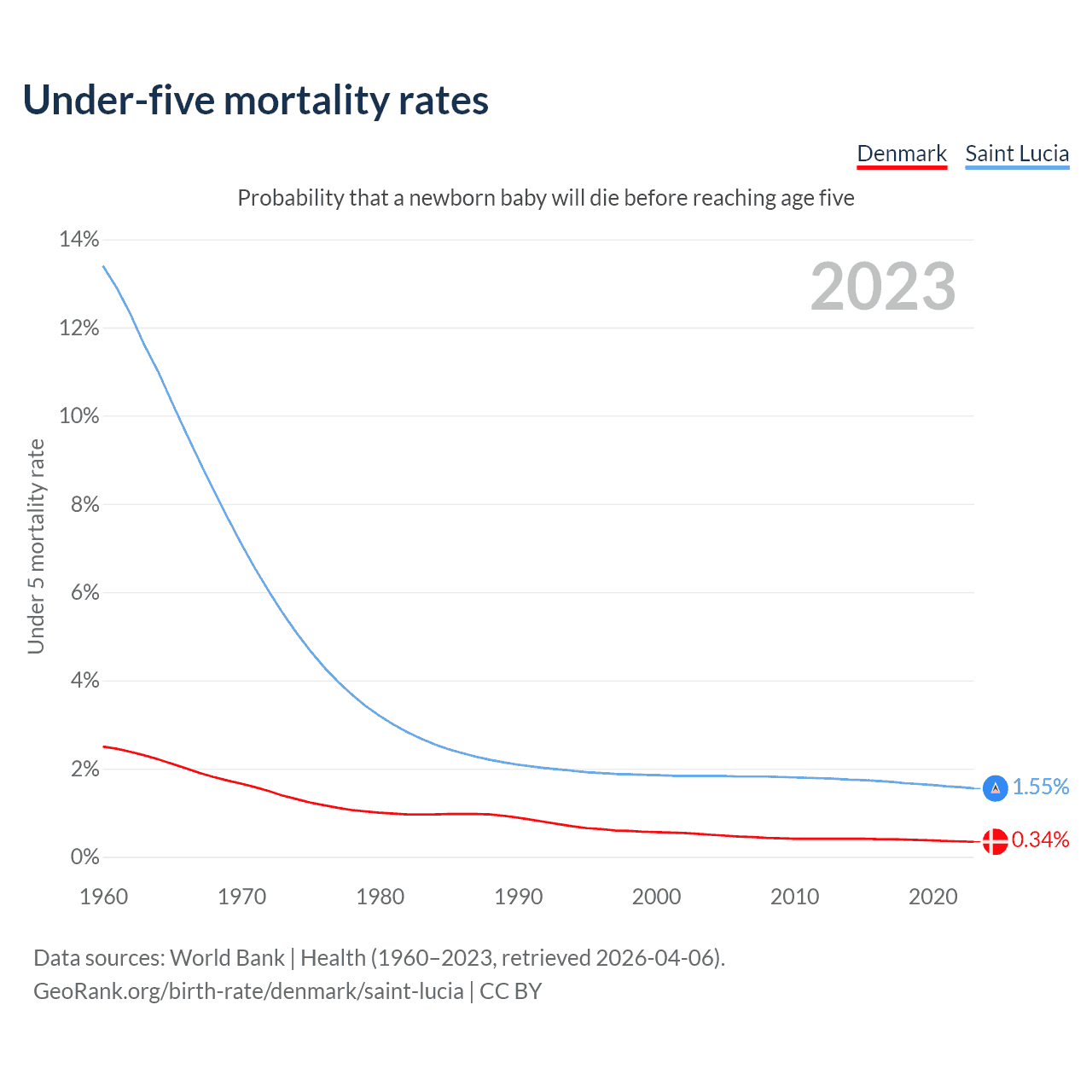 The chance that a newborn baby will die before reaching age five is 0.34% in Denmark and 1.55% in Saint Lucia. Above is a chart with historical data on under-five mortality rates.