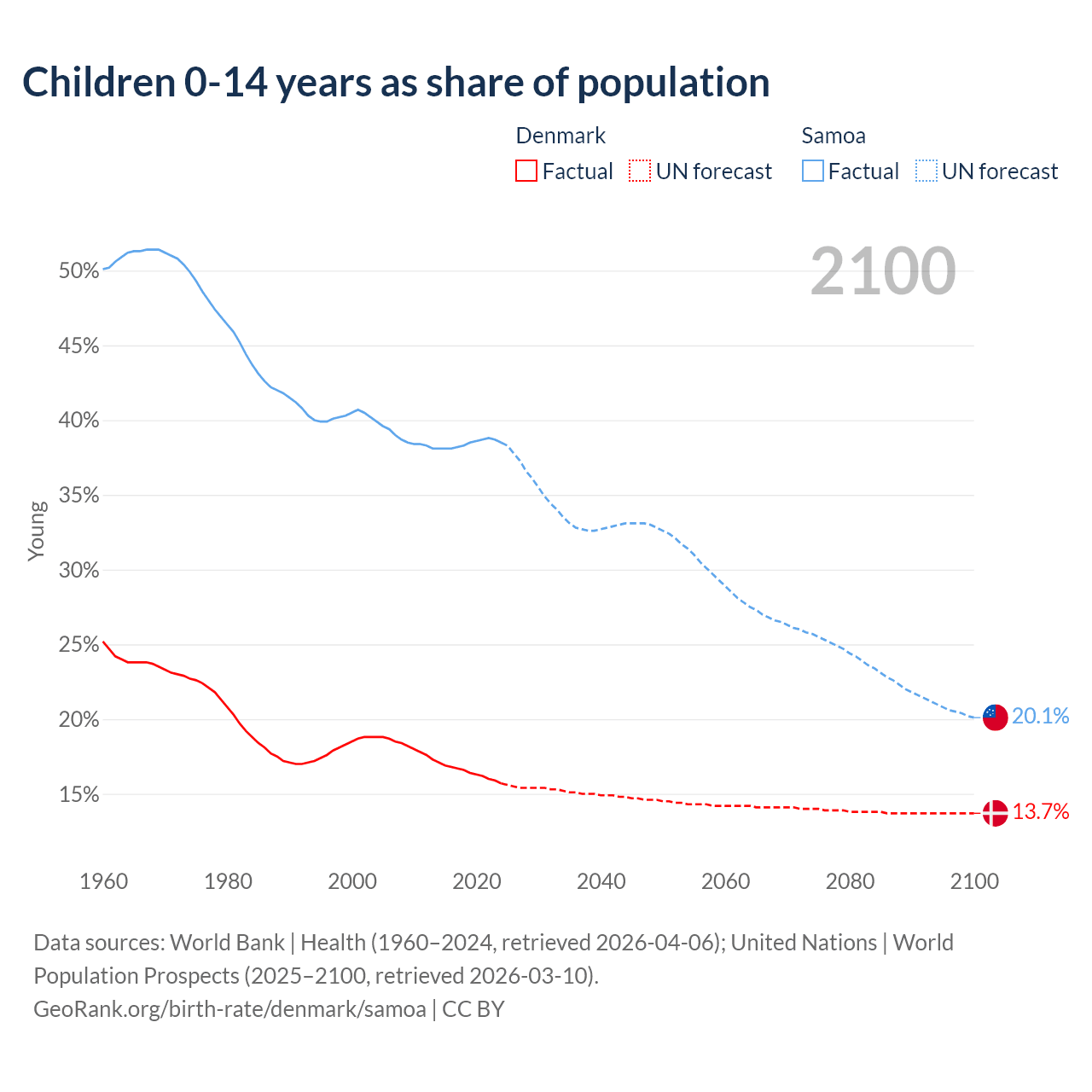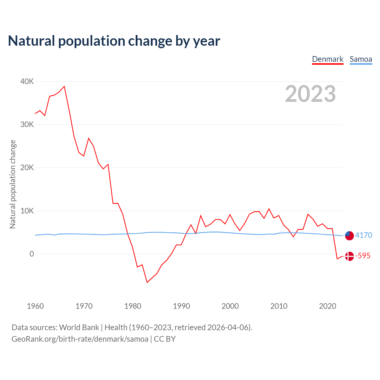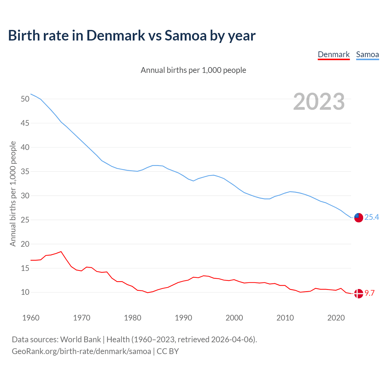 Denmark has an annual birth rate of 9.7 births per 1,000 people, compared to 25.4 for Samoa. The average number of children a woman is expected to have during her lifetime — the fertility rate, is 1.5 in Denmark and 3.83 in Samoa — 155.3% difference.
