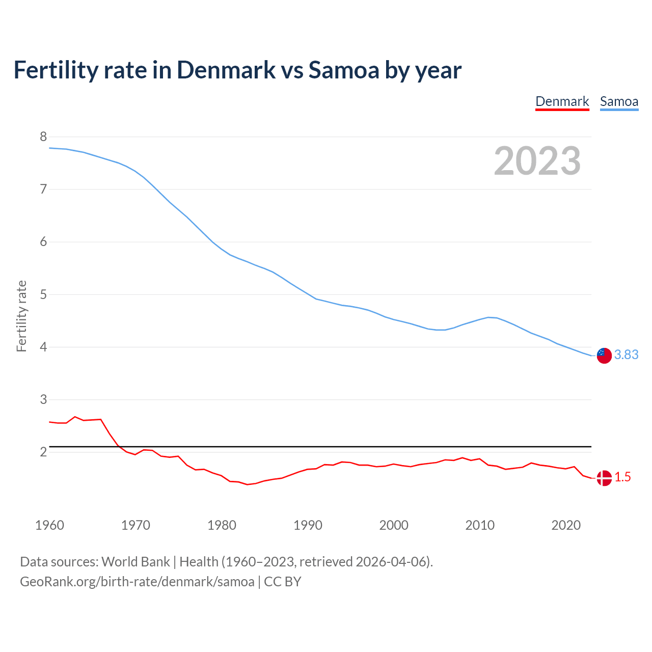 According to the latest available data on birth rates, the fertility rate in Denmark was 1.5 children per woman in 2023, compared to 3.83 in Samoa in 2023. The replacement level is considered to be 2.1 children per woman.